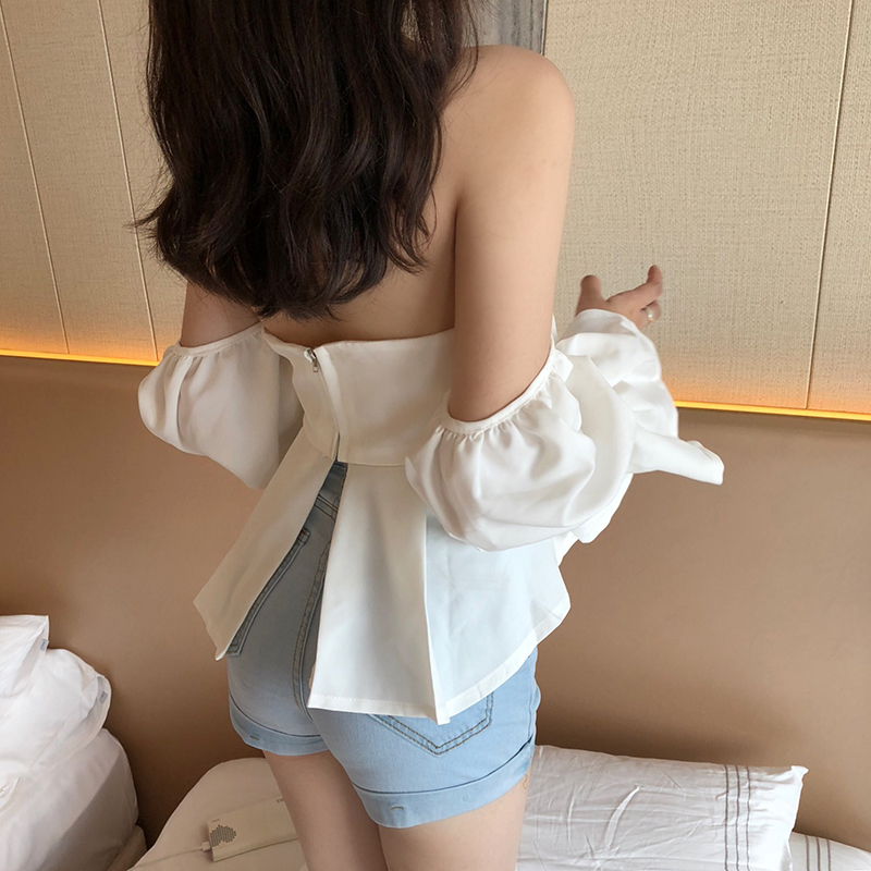 / 2018新款韓版小心機百搭復古chic氣質時尚女一字肩燈籠袖雪紡上衣
