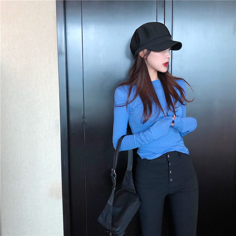 / 秋季新款時尚韓國圓領顯瘦純色堆堆袖修身打底衫百搭t恤女上衣潮