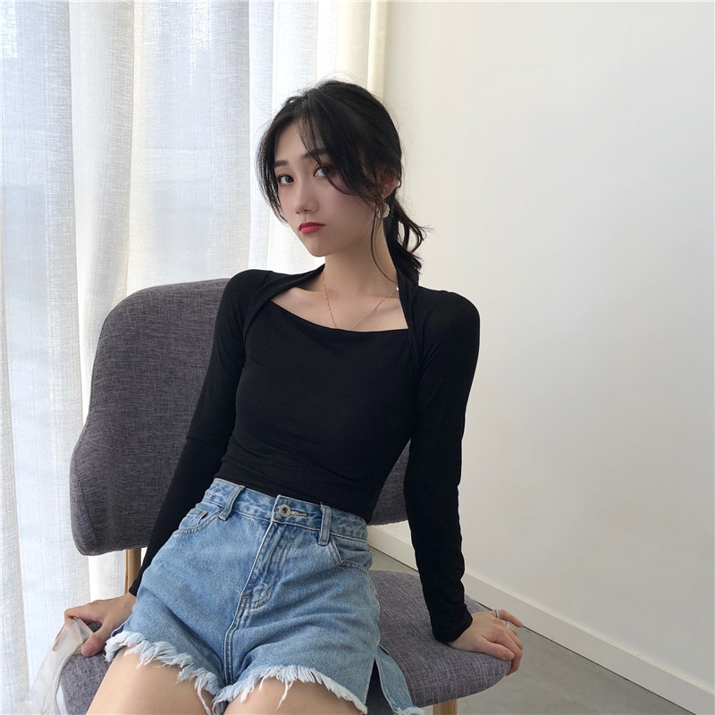 復古chic時尚2018新款純色修身百搭氣質T恤短款顯瘦長袖上衣女潮