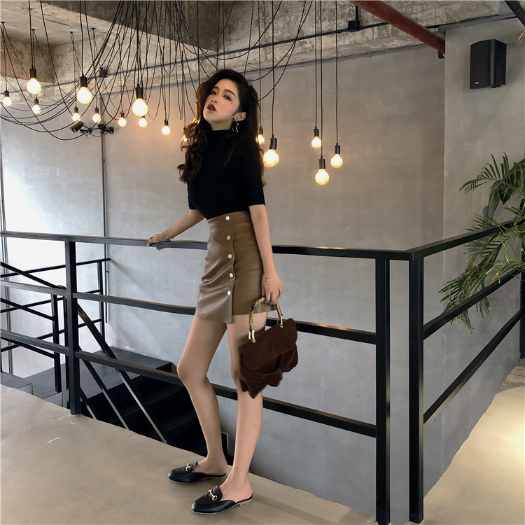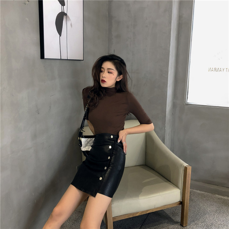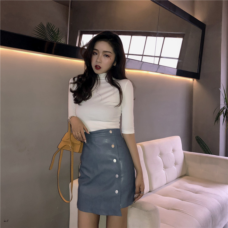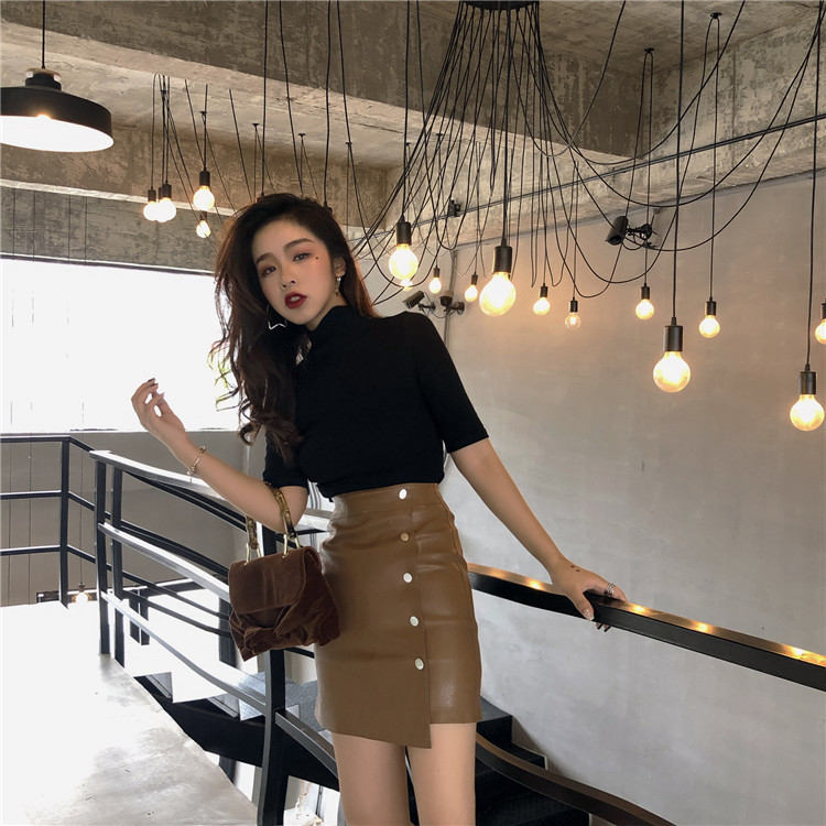 / 復古chic風早秋新款基礎純色半高領T恤高腰顯瘦皮短裙時尚套裝女