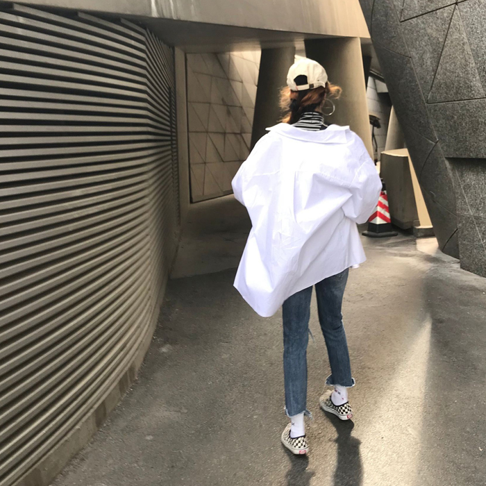 chic港味中長款簡約百搭翻領寬松燈籠袖白襯衫女長袖秋季女上衣