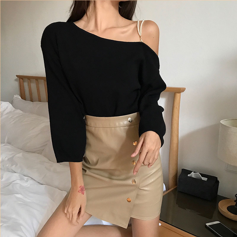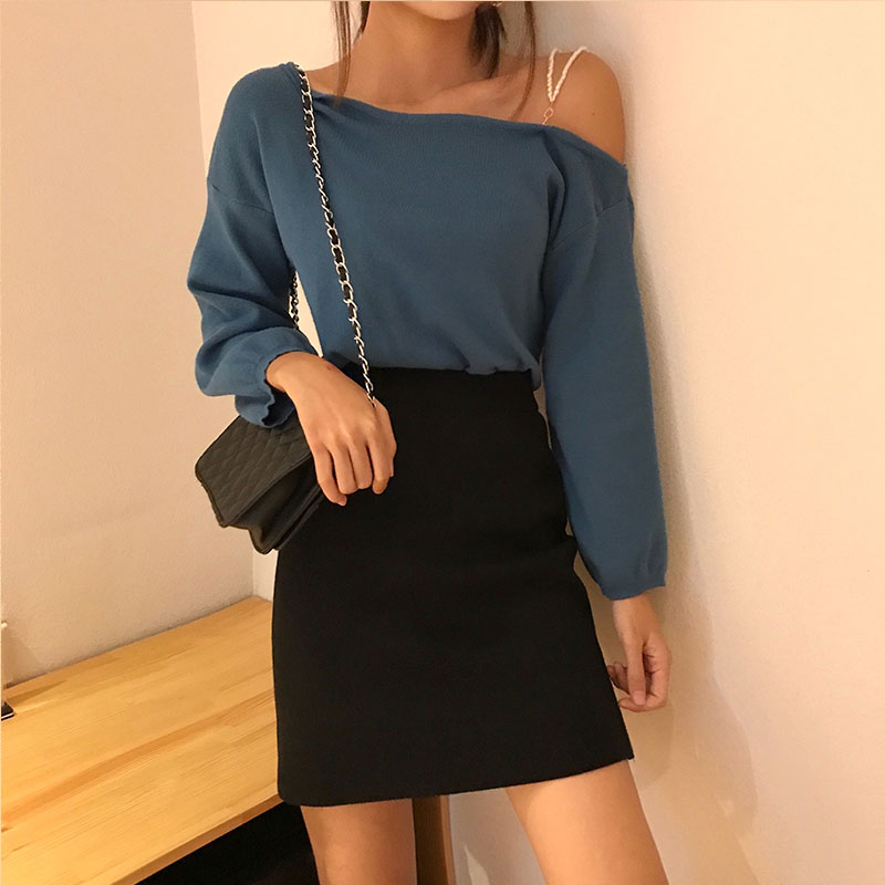 / 2018秋裝韓版時尚斜肩上衣女純色針織衫百搭chic氣質顯瘦寬松T恤