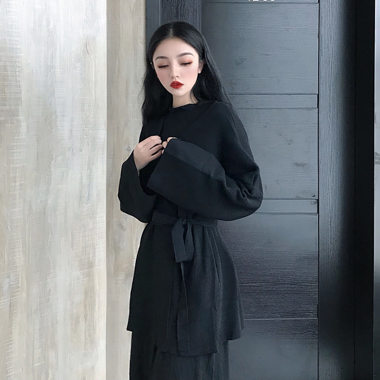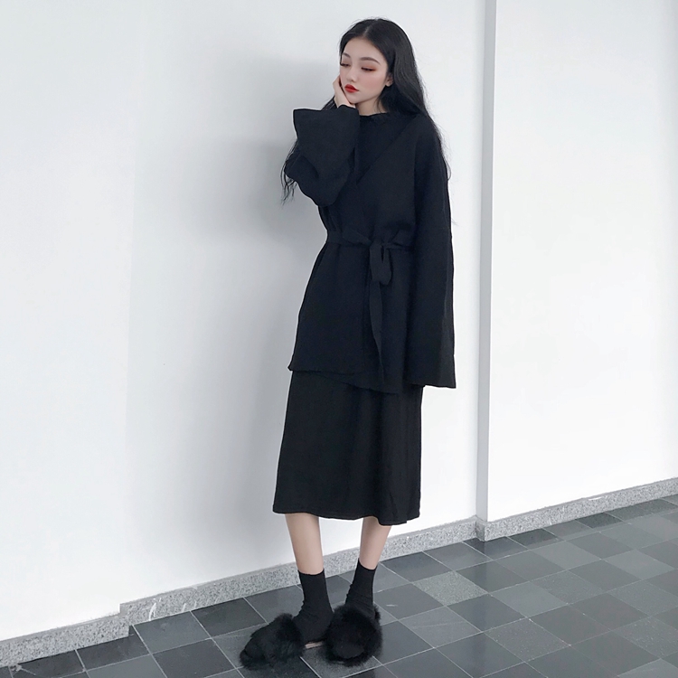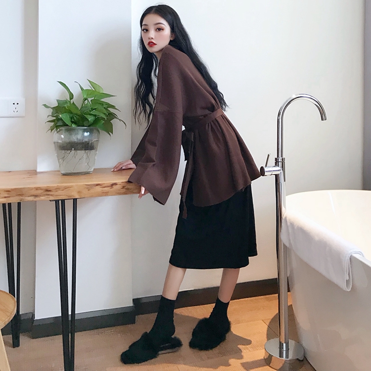 / 秋裝新款打底百搭連衣裙開衫慵懶風毛衣女外套寬松V領時尚套裝潮