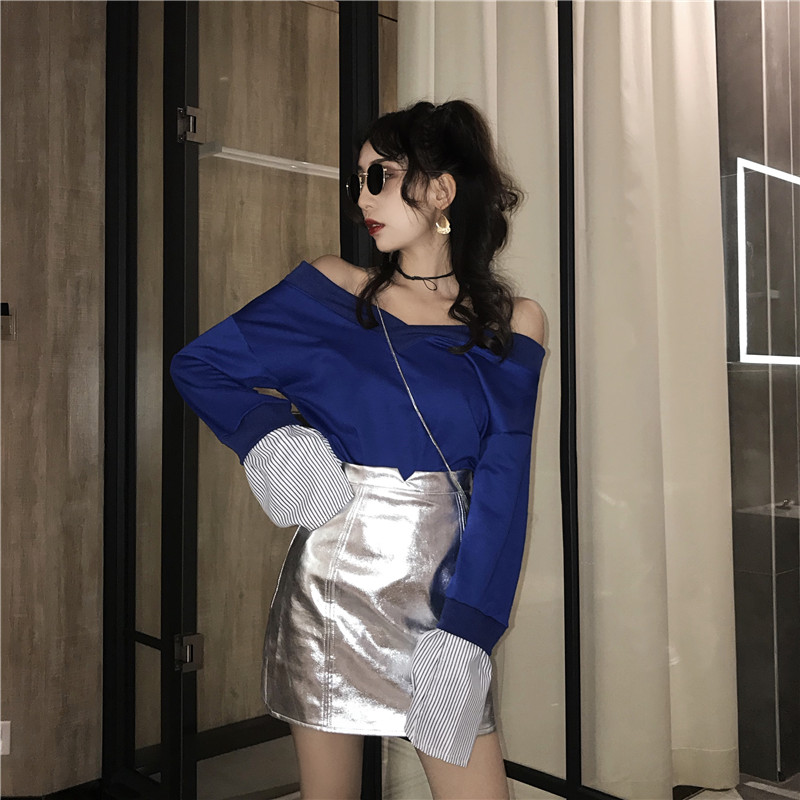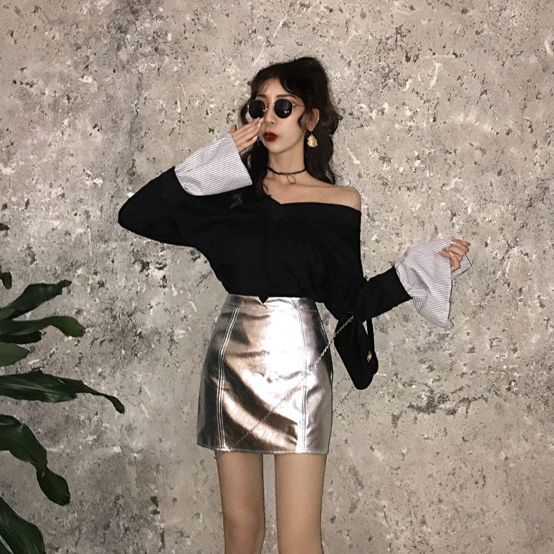 / 港味新款寬松V領長袖百搭衛衣小開叉高腰亮面皮半身裙時尚套裝女