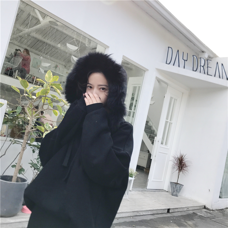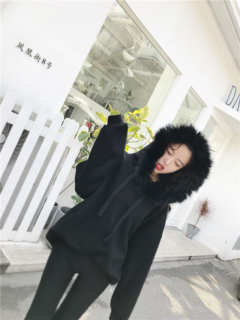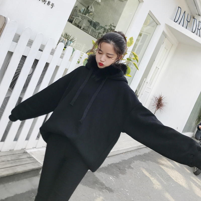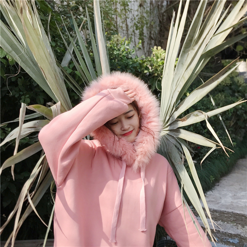 / 2018秋冬新款韓版純色寬松上衣女chic毛毛領加絨加厚百搭連帽衛衣