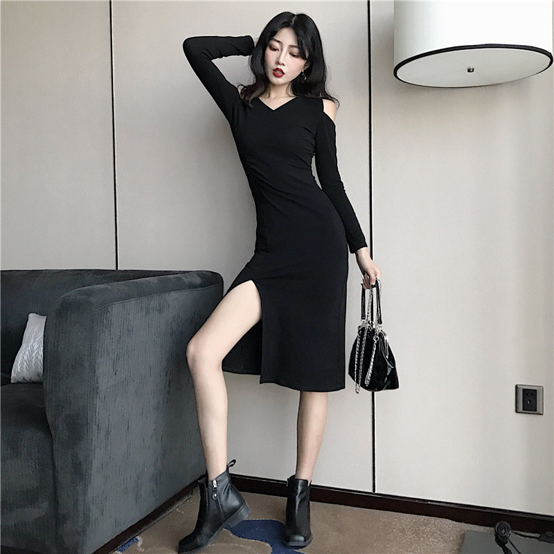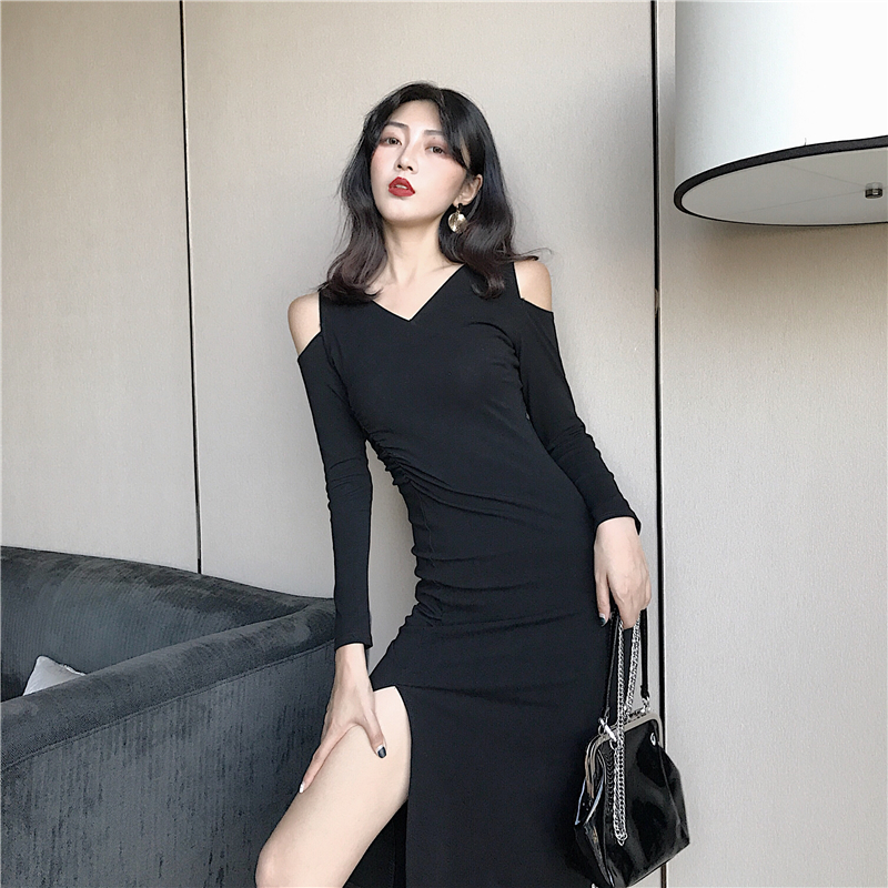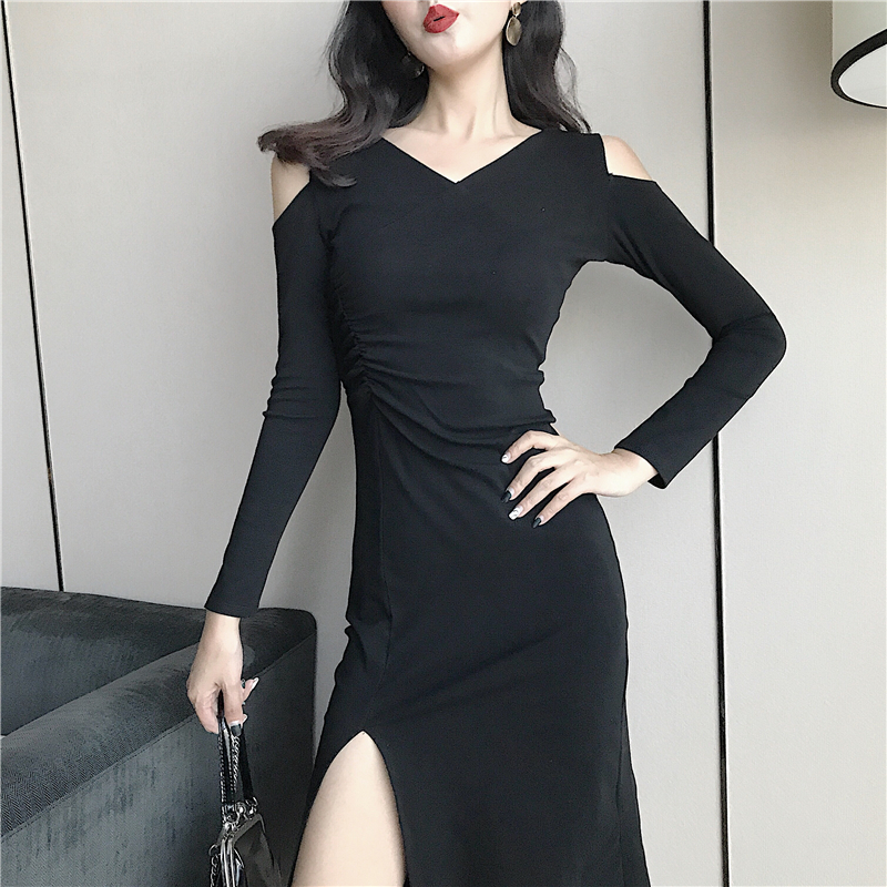 / 晚晚風2018秋裝新款韓版漏肩打褶修身開叉休閑裙中長款打底連衣裙