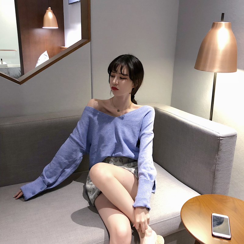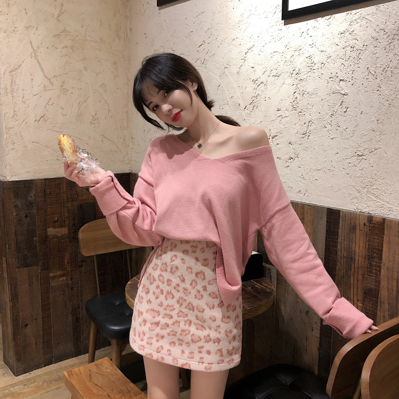 chic新款韓版V領卷袖針織衫寬松側開叉毛衣呢子A字豹紋裙時尚套裝