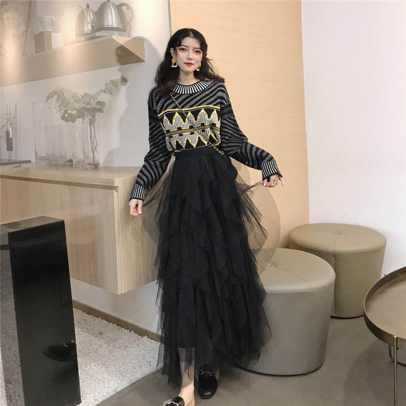 / 秋冬新款寬松幾何圖案印花毛衣時尚套裝高腰百搭網紗半身裙兩件套
