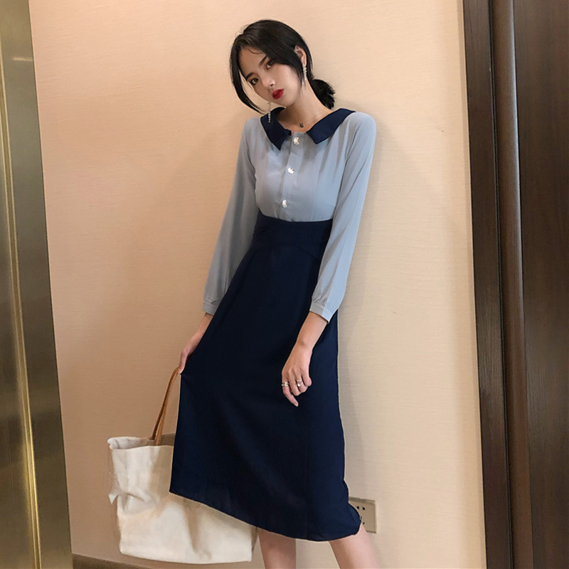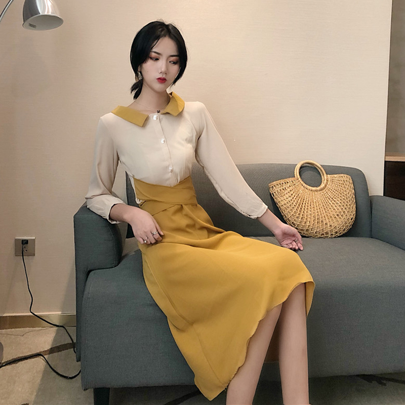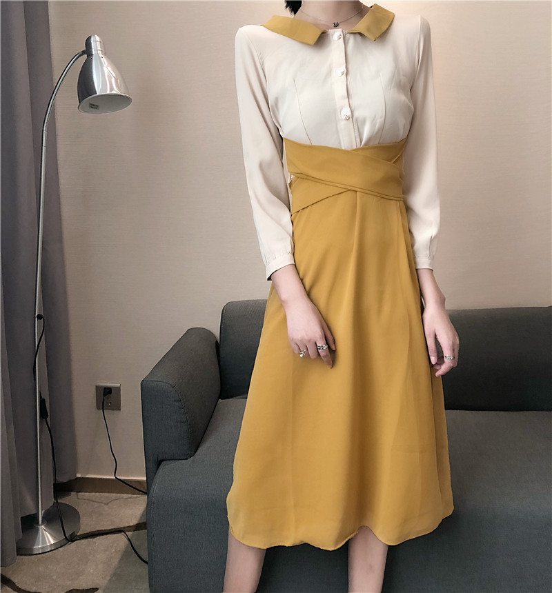 / 2018新款港味時尚設計感百搭chic氣質復古拼色綁帶中長款連衣裙女