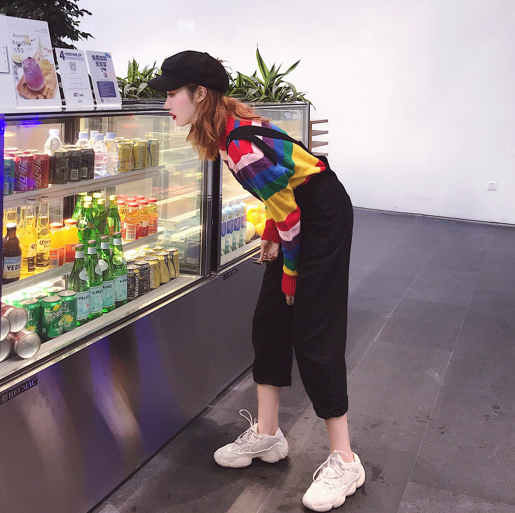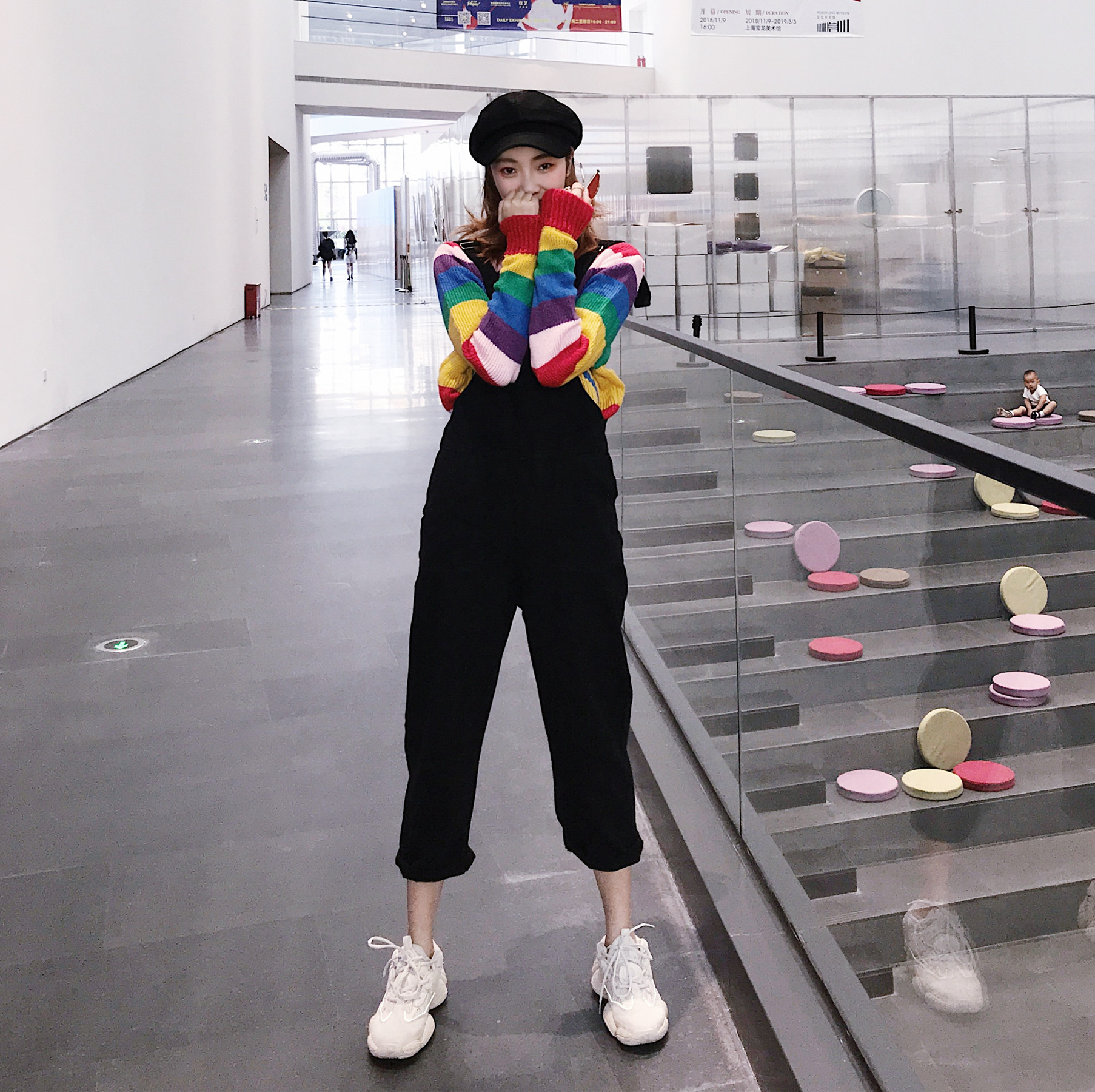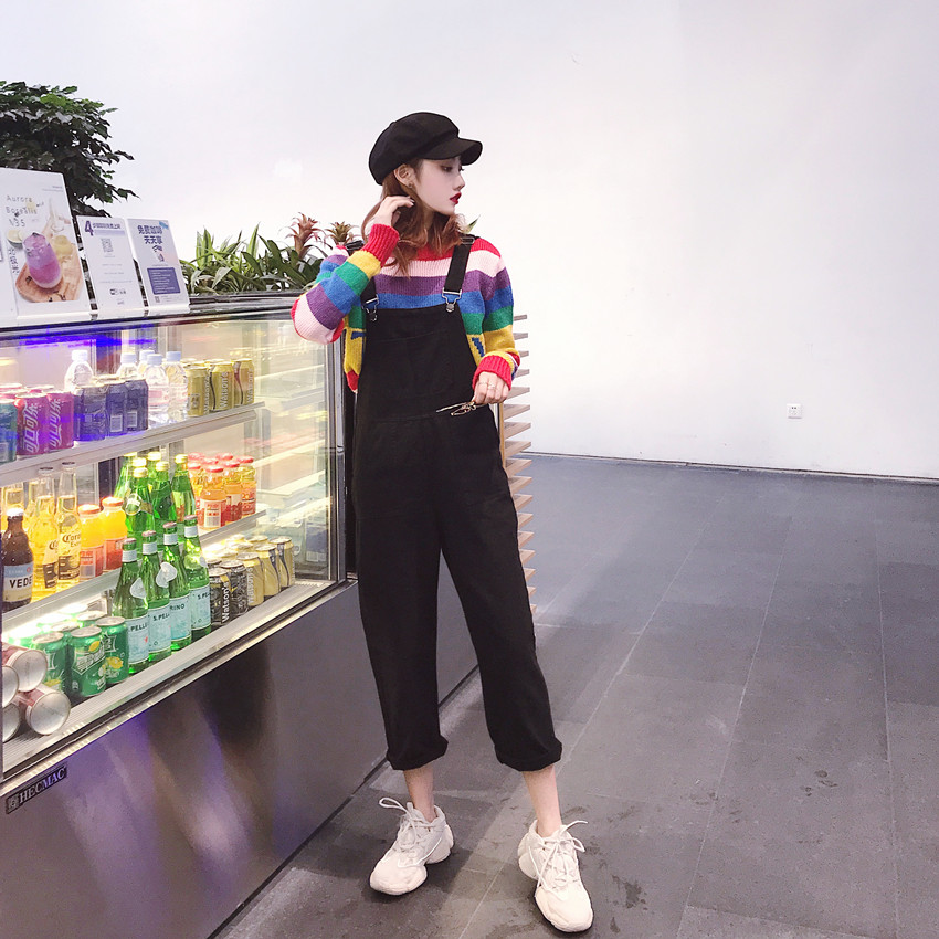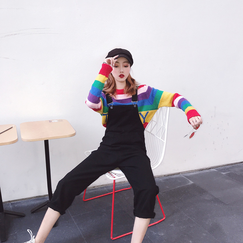 背帶褲|彩虹條紋毛衣