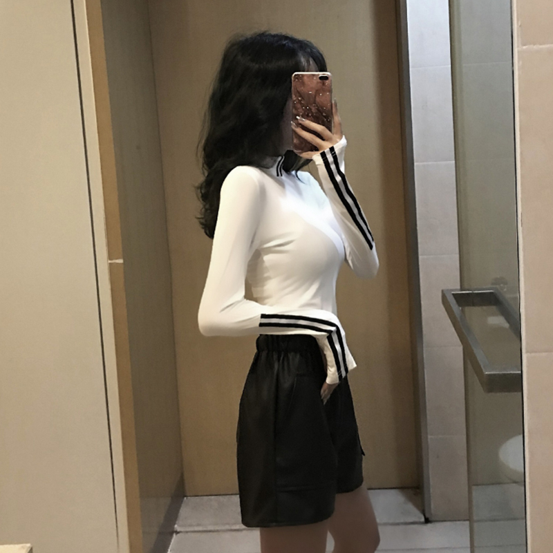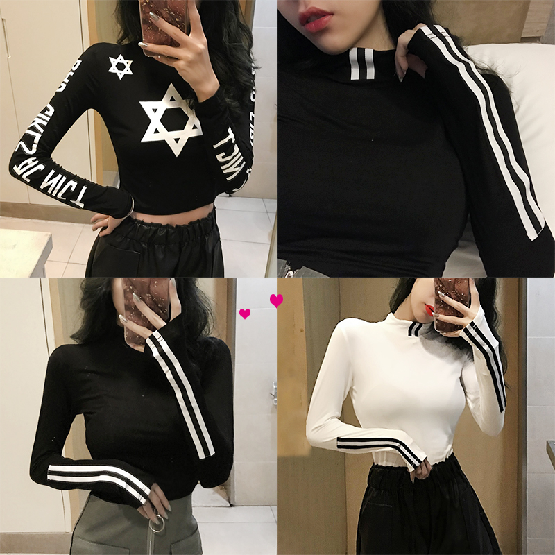 chic風2018秋季新款顯瘦半高領時尚印花上衣百搭長袖T恤打底衫女