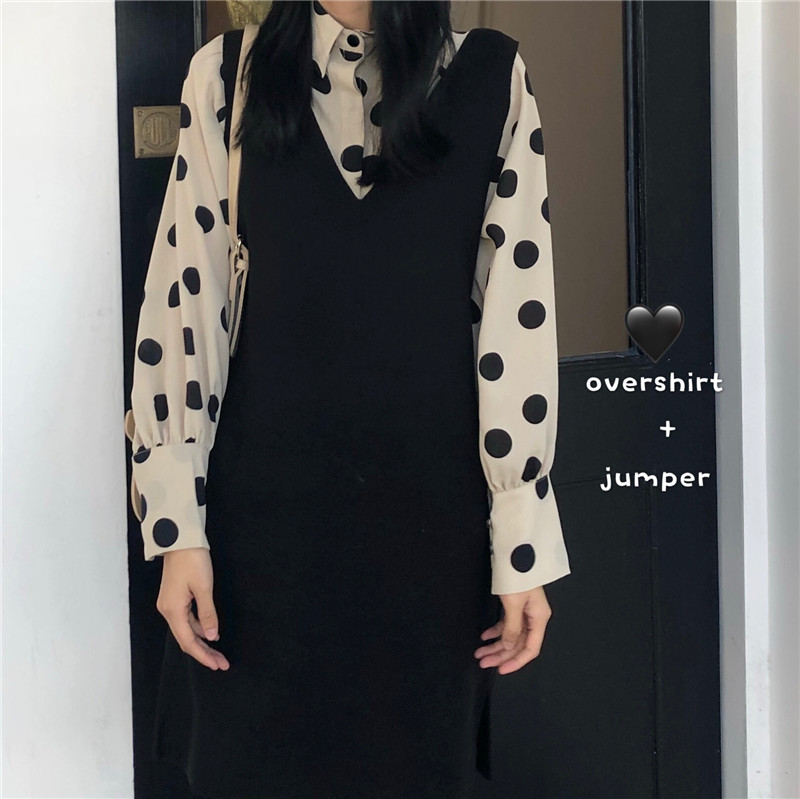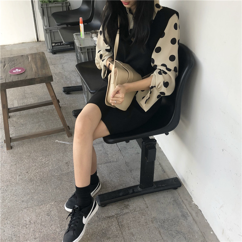 / 韓版秋裝女2018新款可愛V領針織馬甲女套裝+波點襯衫時尚兩件套潮