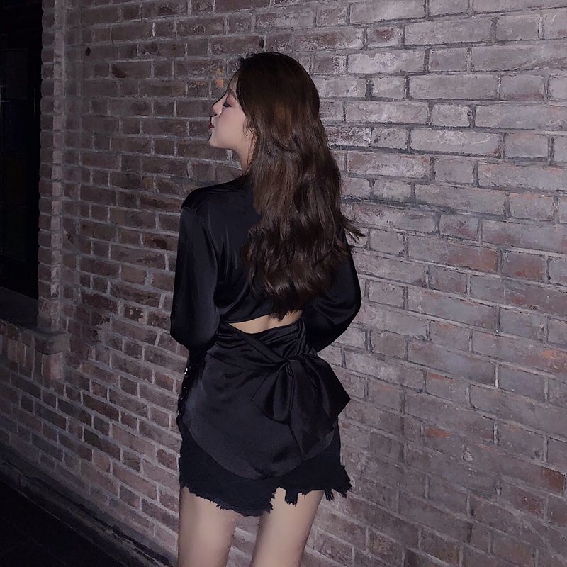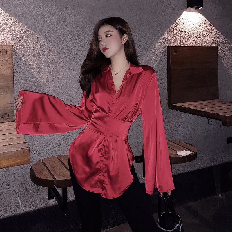 復古收腰綁帶喇叭袖襯衫女中長款顯瘦休閑緞面小香風長袖上衣氣質