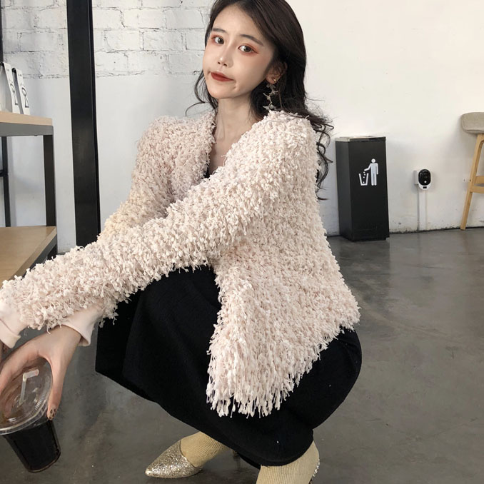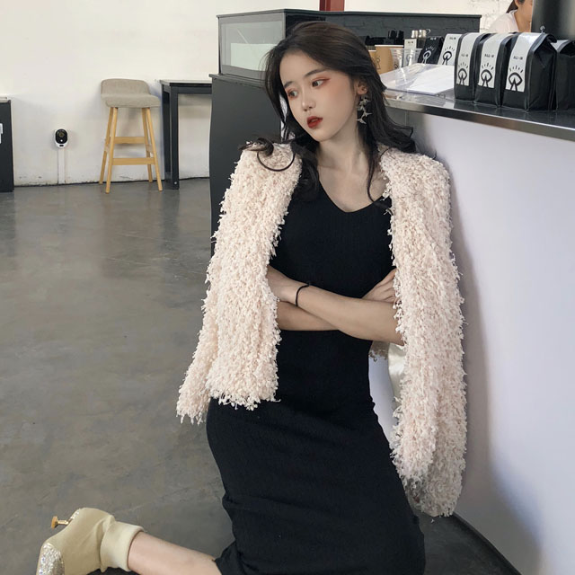 港味時尚套裝毛毛開衫外套+吊帶針織連衣裙女秋冬2018新款兩件套