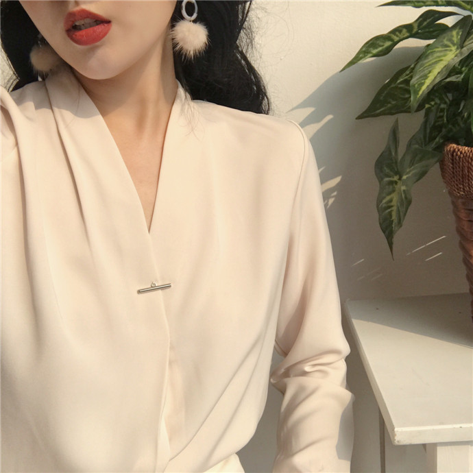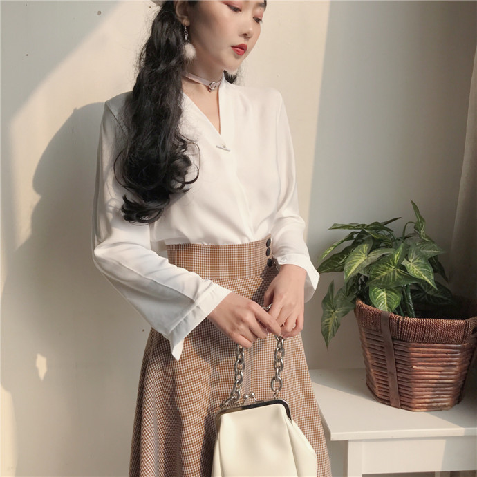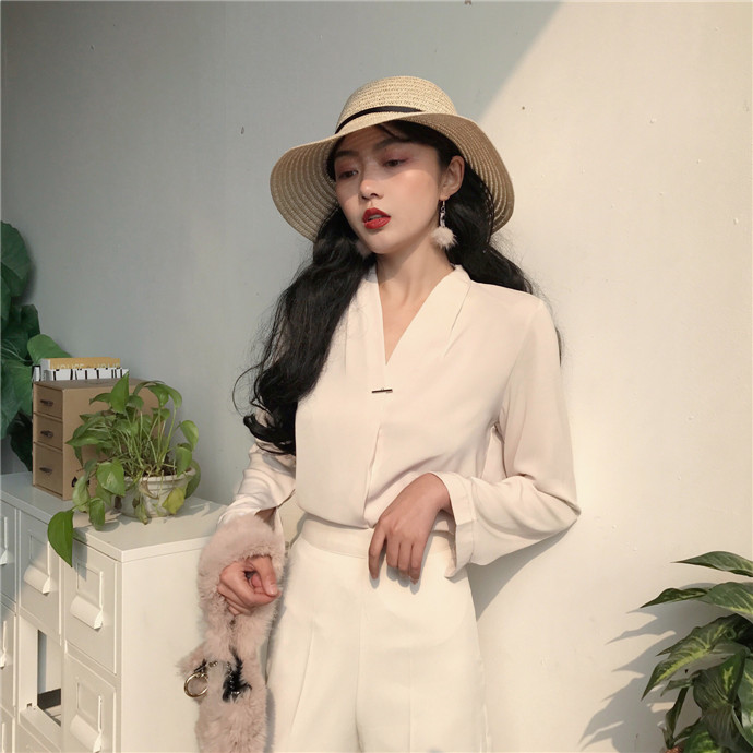 / 2018新款秋季V領小清新百搭港風復古chic上衣氣質時尚長袖襯衣女