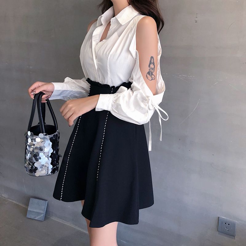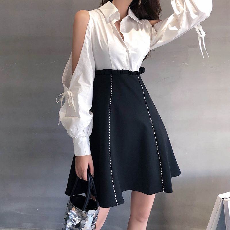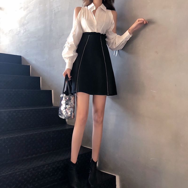 / 2018港味新品chic減齡性感小心機露肩長袖拼接修身顯瘦A字連衣裙