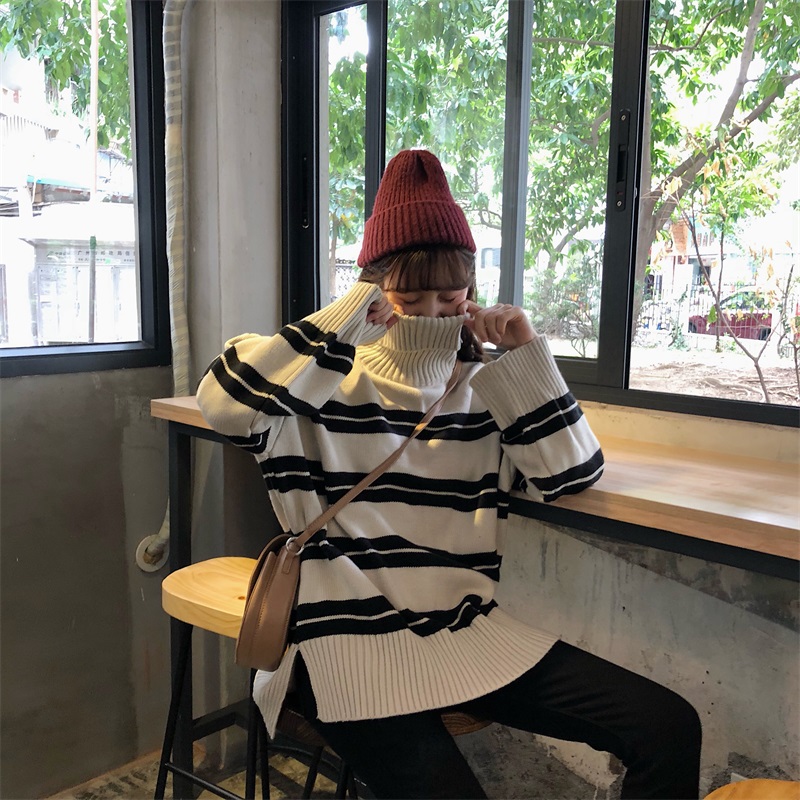 / 韓版修身顯瘦條紋拼色加厚保暖長袖高領打底毛衣女秋冬2018新款潮