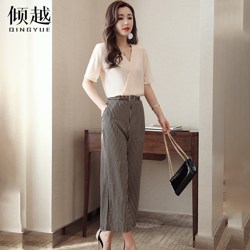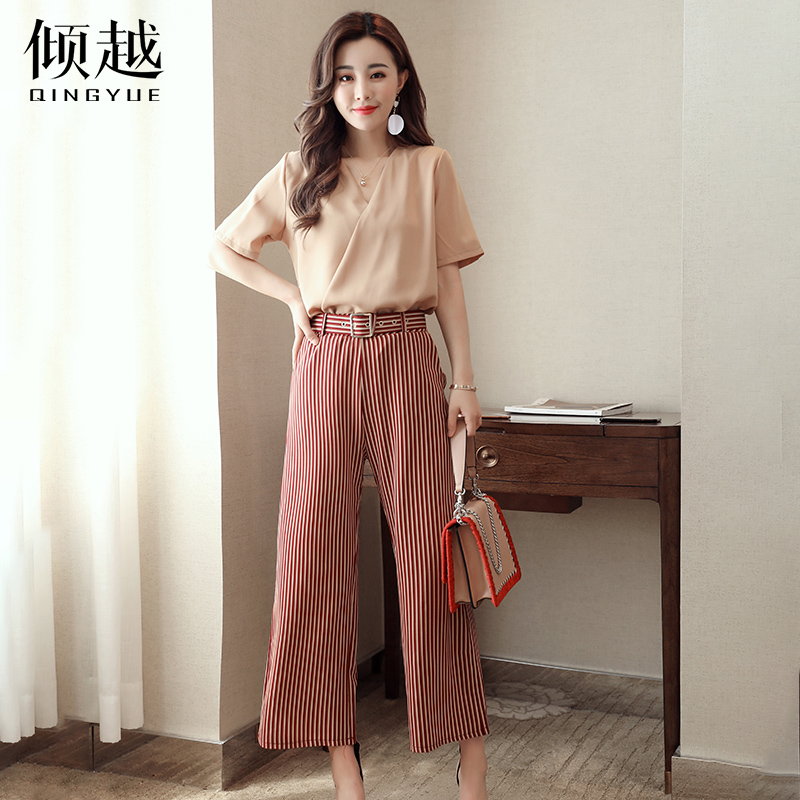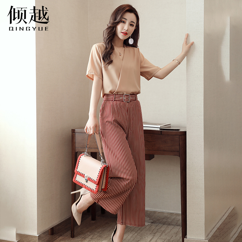 / 條紋雪紡闊腿褲套裝高腰裙褲2017女夏季寬松九分褲時尚兩件套褲裙