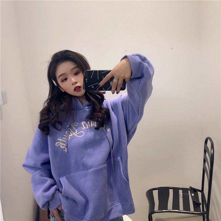 / 港味慵懶風上衣女寬松復古刺繡英文連帽加絨百搭慵懶衛衣女秋新款