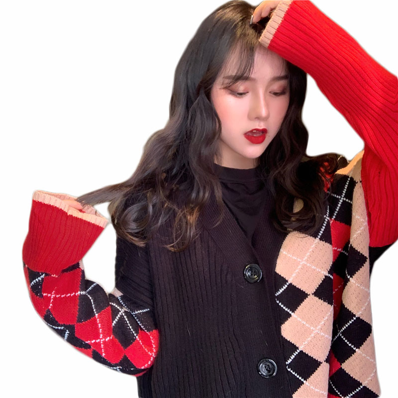 / 撞色格子慵懶風寬松網紅毛衣女2018新款復古韓版時尚針織開衫外套