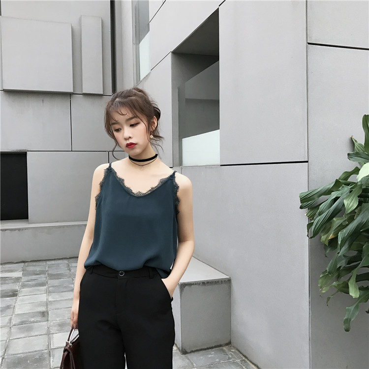/ 韓國新款chic風百搭修身顯瘦V領蕾絲純色學生小清新吊帶背心上衣