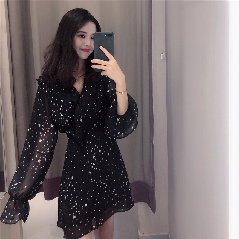 / 早秋新款荷葉邊顯瘦不規則v領收腰甜美氣質時尚星星雪紡連衣裙女