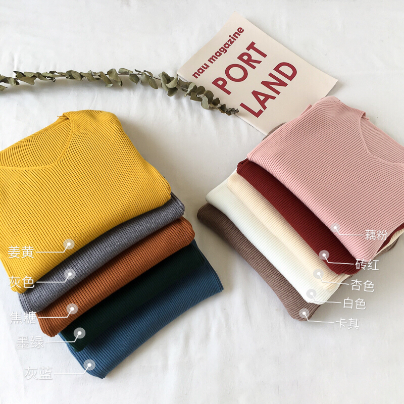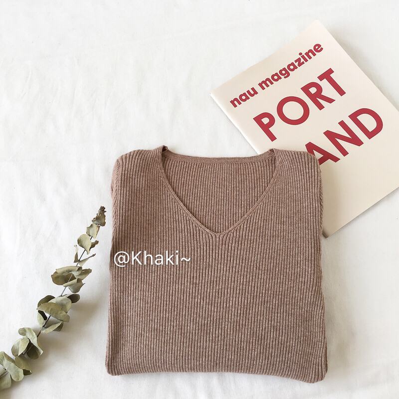 / 秋冬新款V領針織長袖修身緊身保暖打底衫上衣復古套頭顯瘦毛衣女