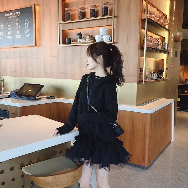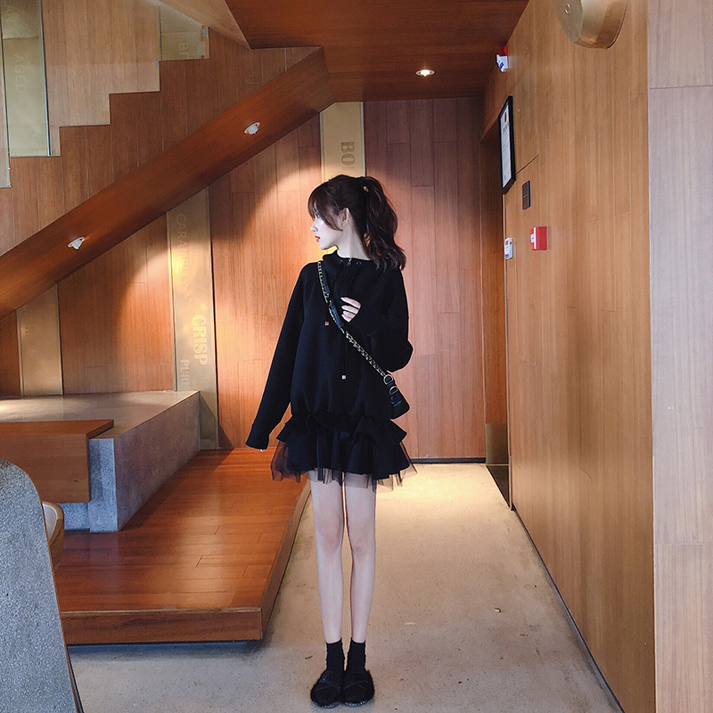 新款時尚衛衣連衣裙拼接假兩件紗裙少女茶歇裙長袖荷葉邊魚尾裙潮