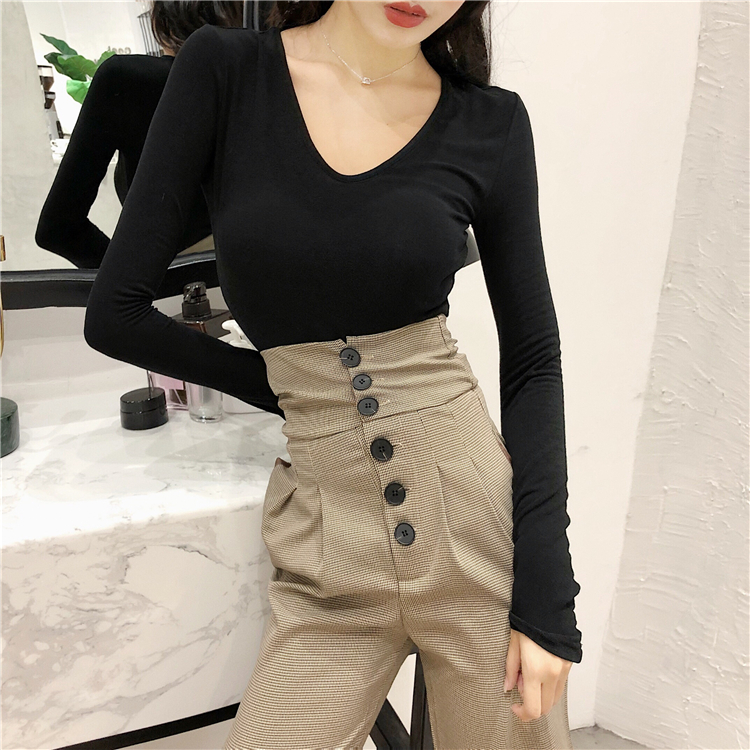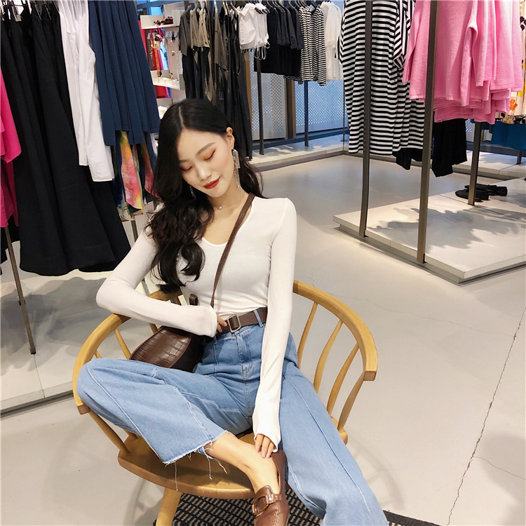 / 2018秋裝新款韓版上衣紋理彈力修身顯瘦棉質純色長袖內搭打底衫女