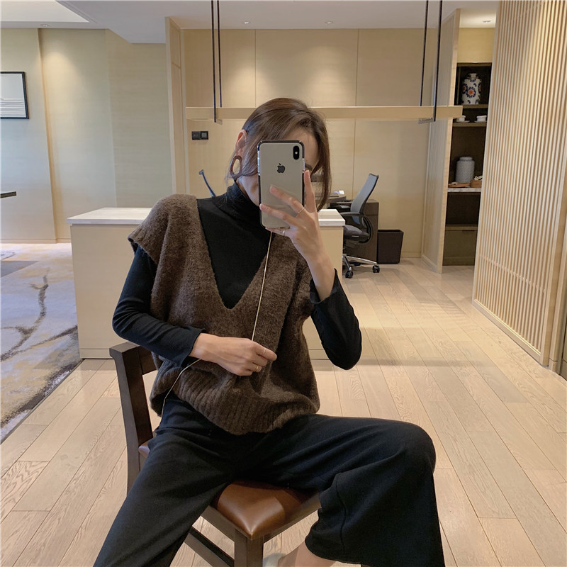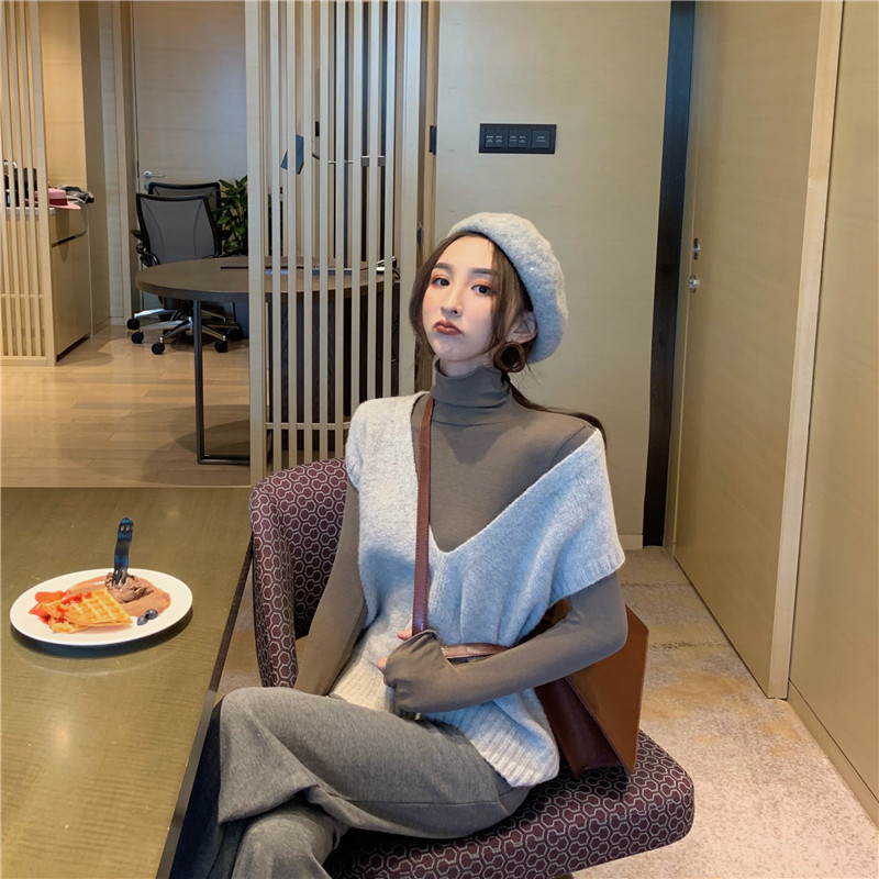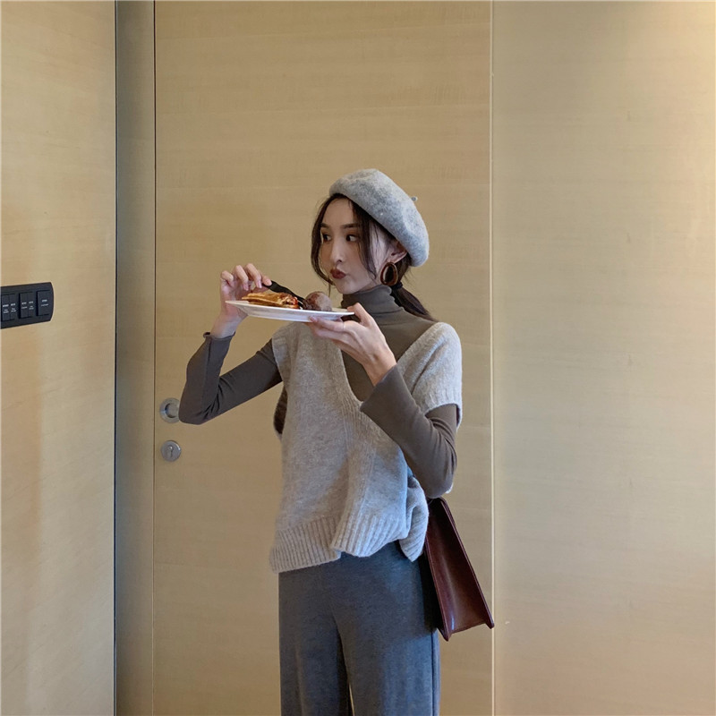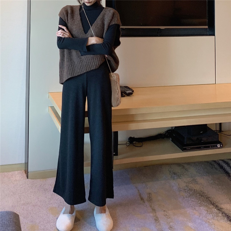 / 新款chic復古針織毛衣背心+簡約百搭高領打底衫+休閑純色闊腿褲女