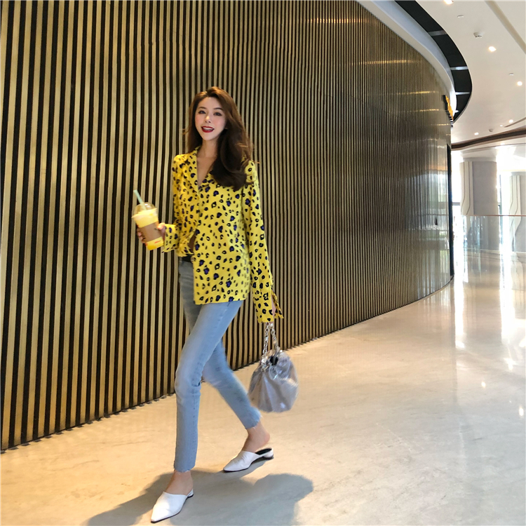 減齡2018年秋季韓國小心機豹紋長袖襯衫時尚潮流耀眼翻領上衣女裝