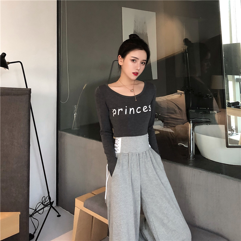 新款百搭圓領字母印花T恤高腰闊腿褲晚晚風休閑時尚港味氣質套裝