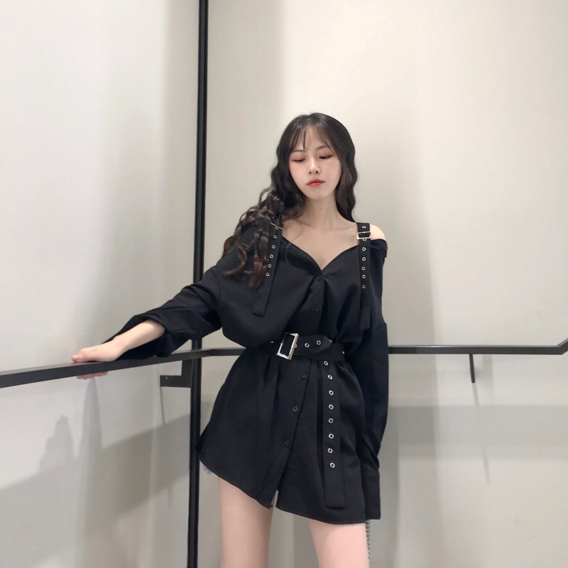 2018早秋新款港風小心機漏鎖骨襯衫bf一字肩上衣百搭中長款襯衫裙