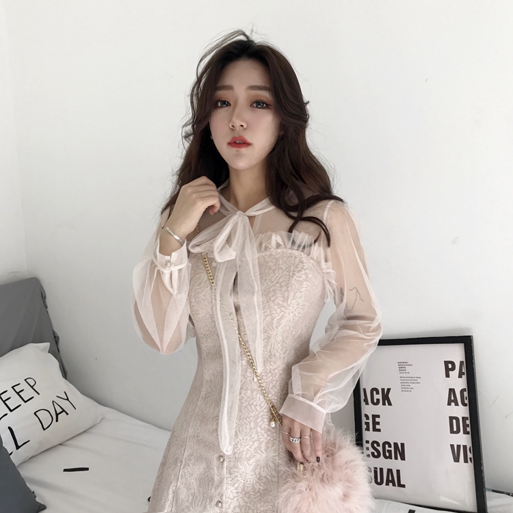 早春韓國chic氣質蝴蝶結長袖網紗拼接抹胸木耳邊修身純色連衣裙女