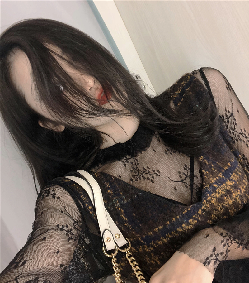 / 氣質復古格子毛呢長款連衣裙時尚套裝喇叭袖網紗打底上衣兩件套女