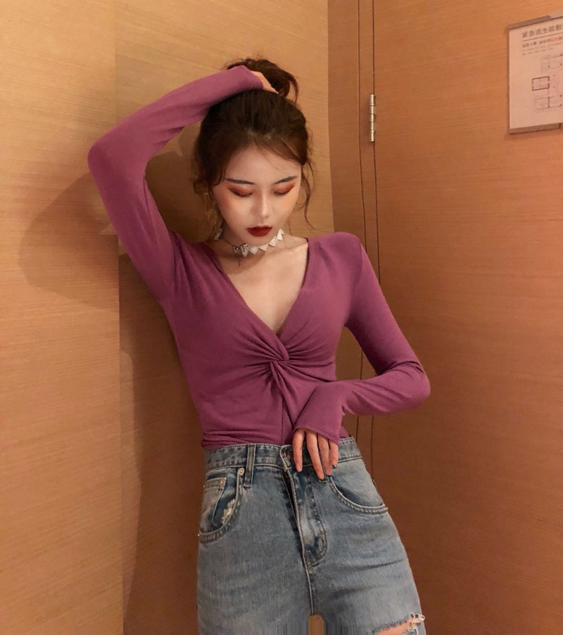 / 2018秋裝V領交叉長袖復古chicT恤修身上衣女新款純色扭結打底衫潮