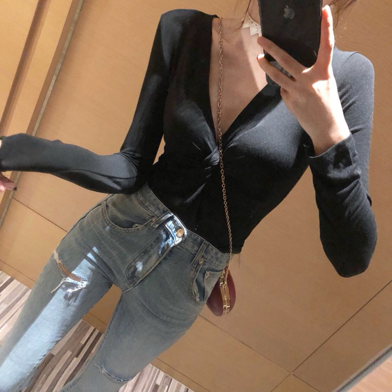 2018秋裝V領交叉長袖復古chicT恤修身上衣女新款純色扭結打底衫潮