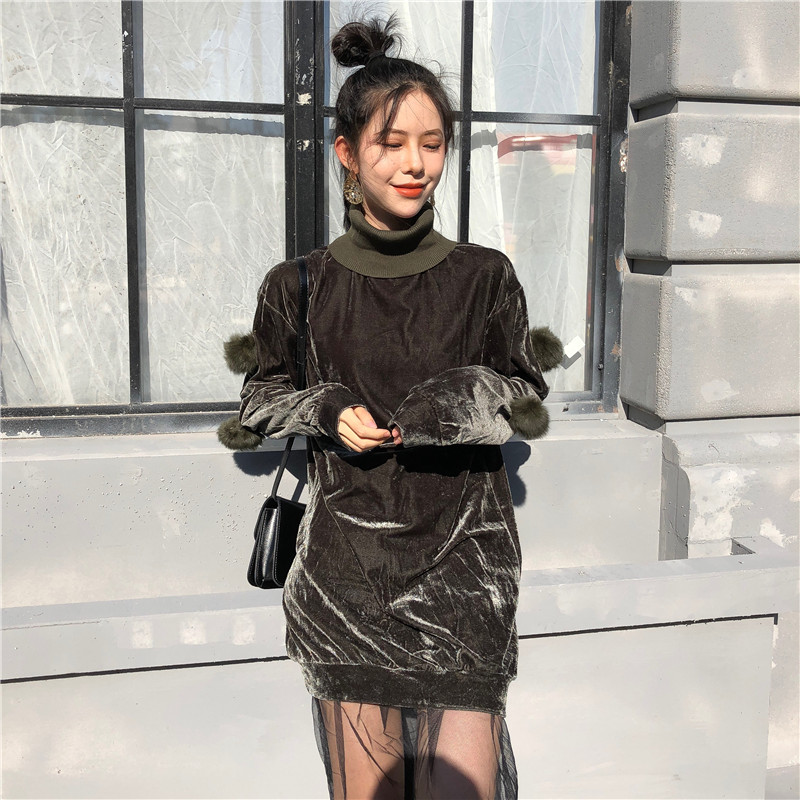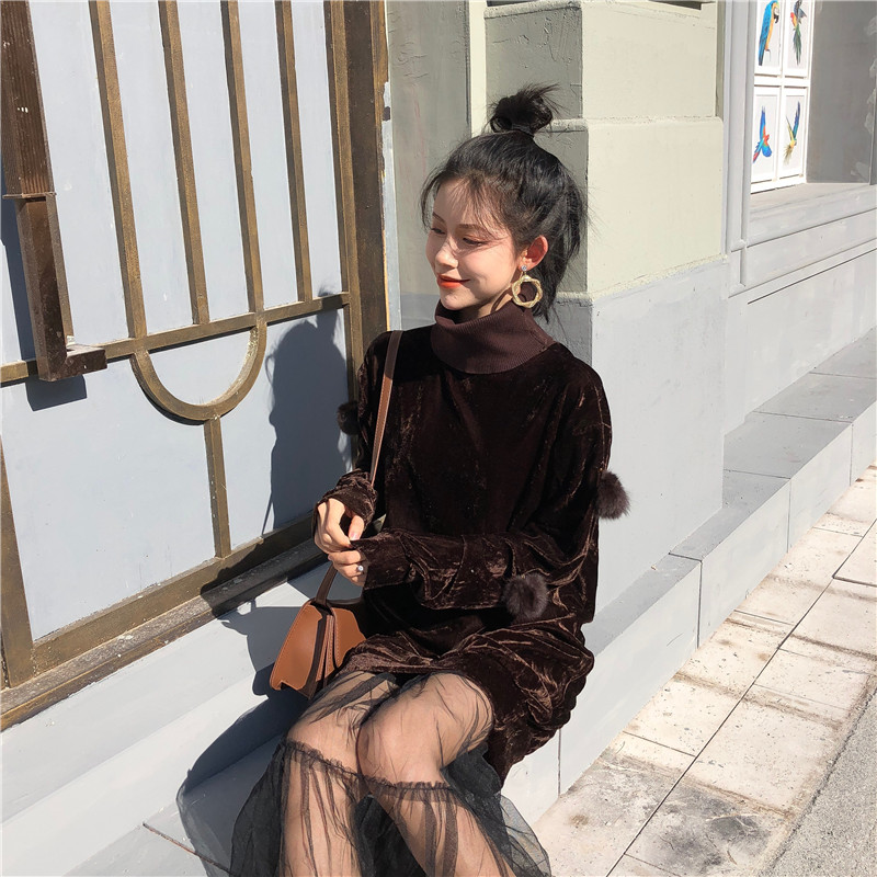 / 新款高領毛球長袖中長款連衣裙甜美氣質時尚套裝網紗半身裙兩件套