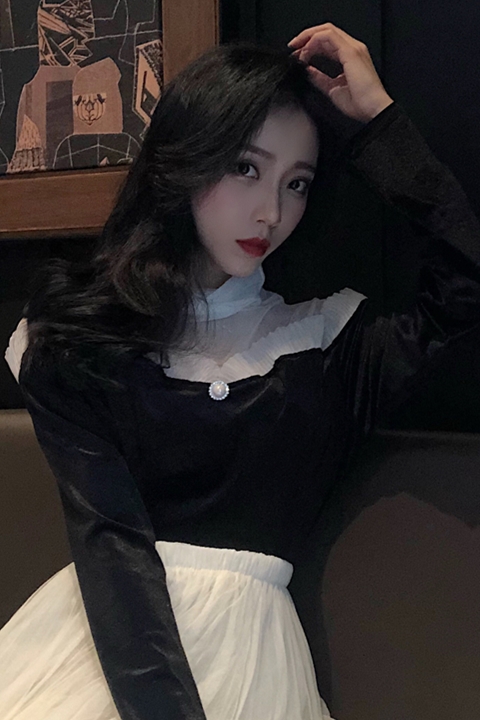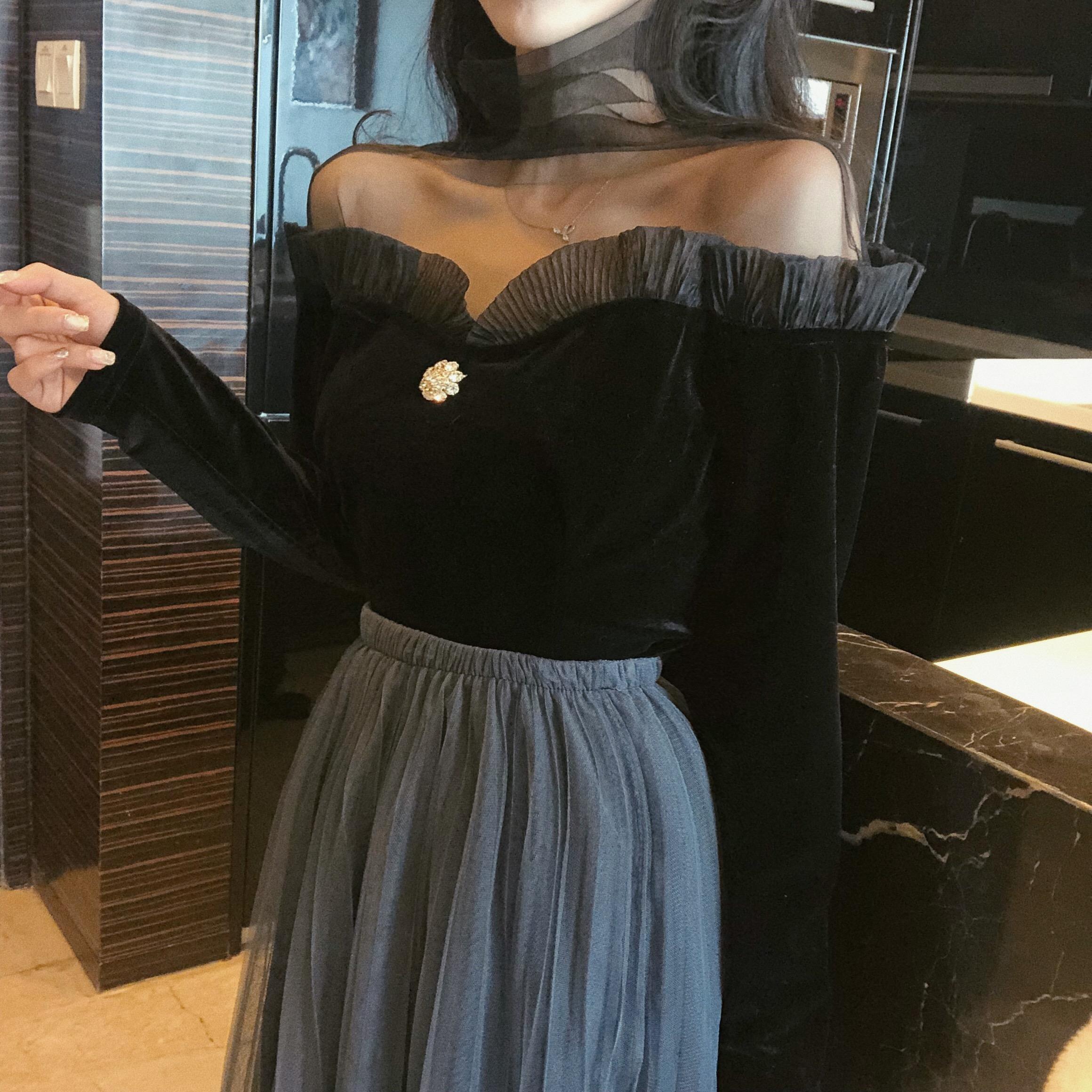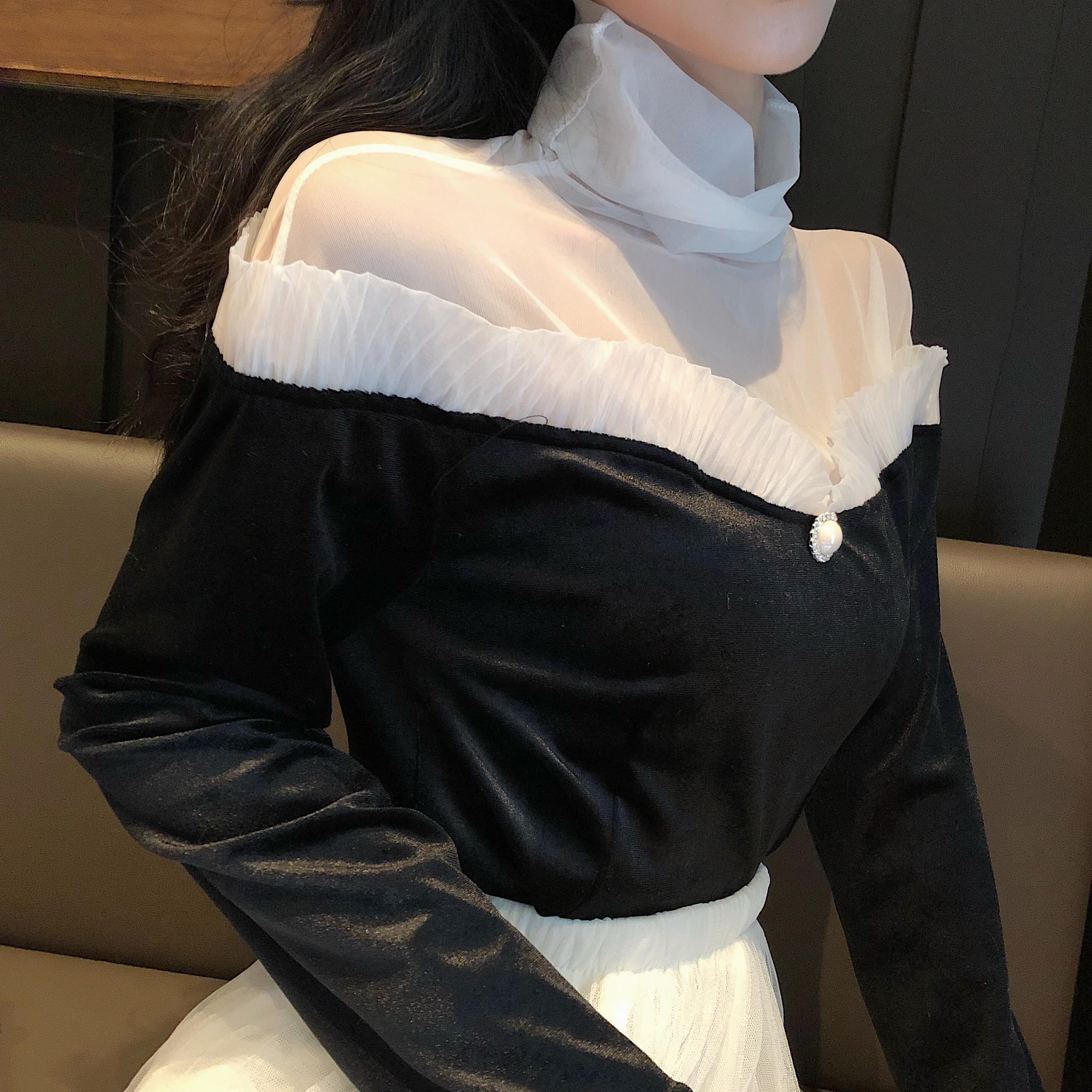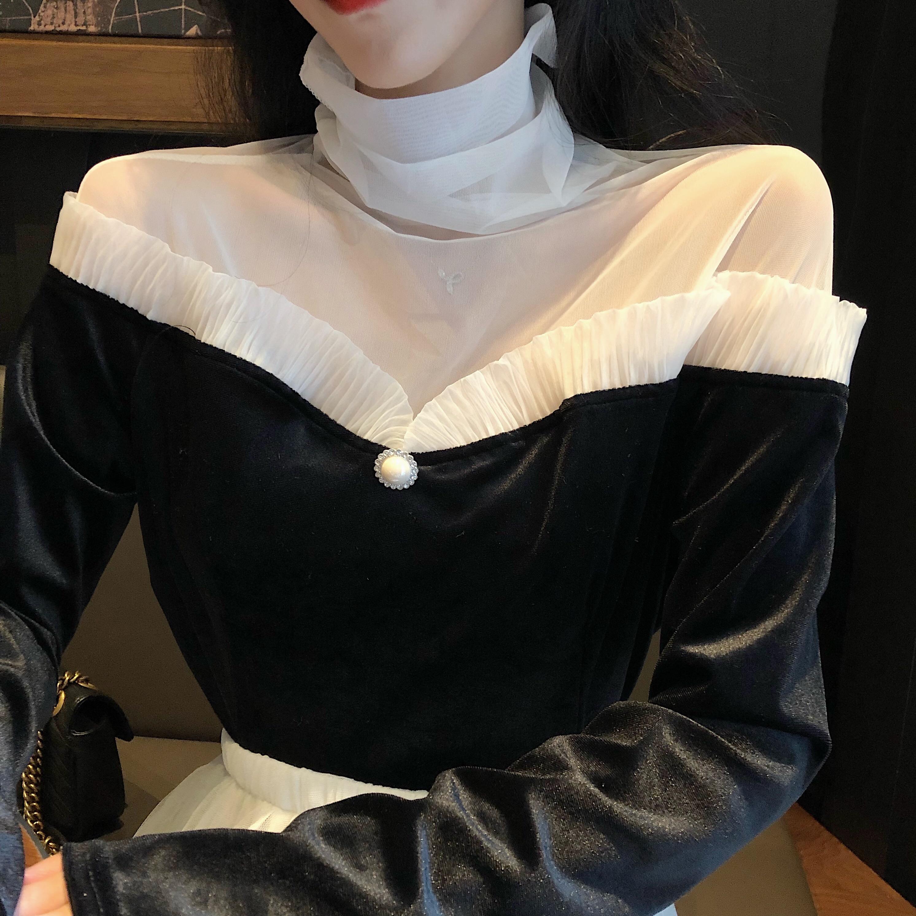/ 2018秋冬新款高領打底衫chic修身設計感T恤時尚百搭拼接蕾絲上衣