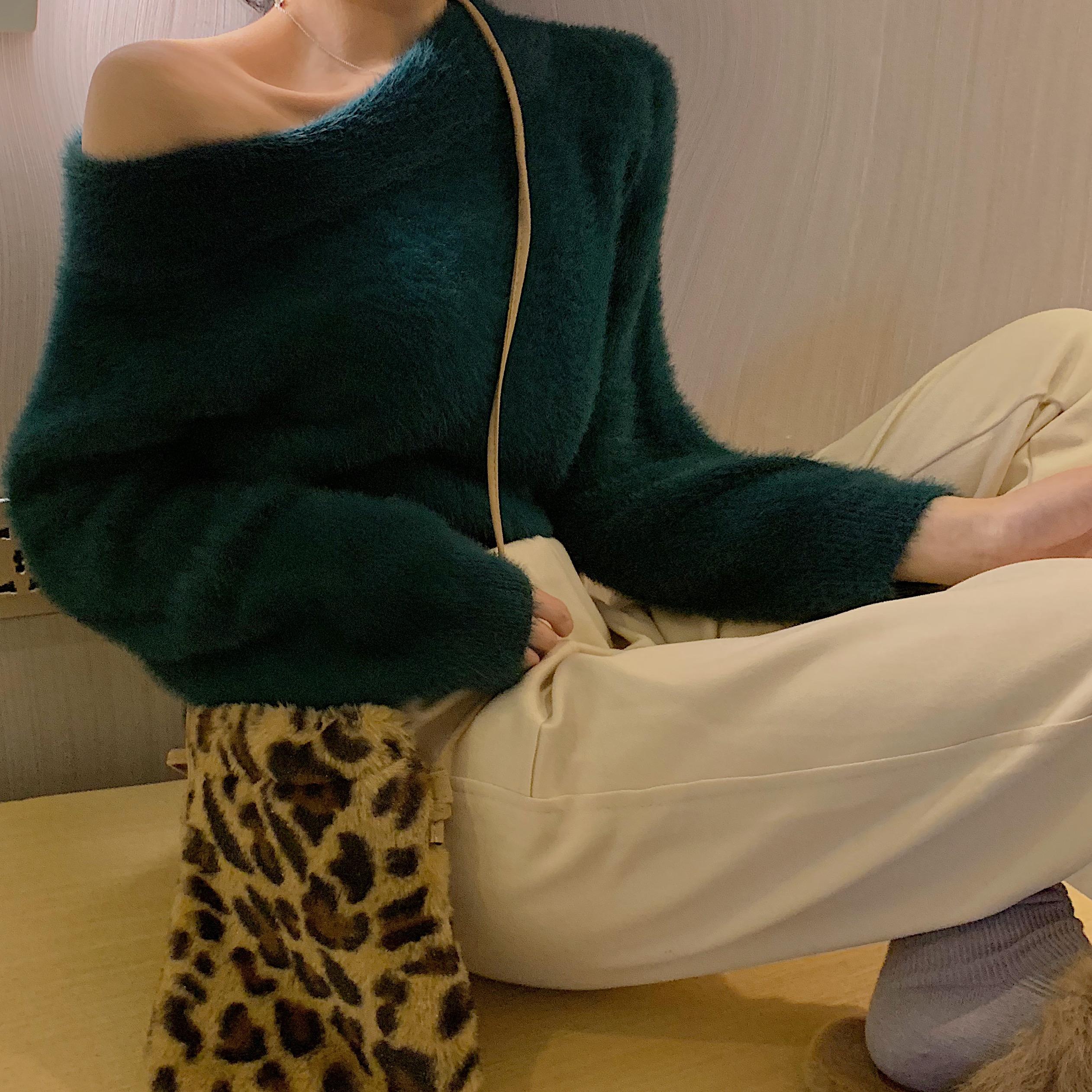 韓版長毛水貂絨一字領短款加厚露肩寬松毛衣