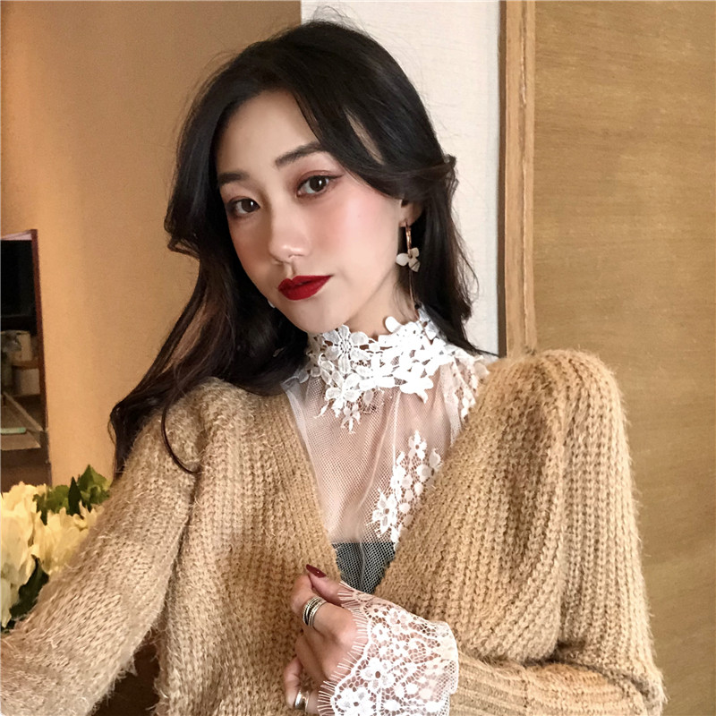 / 女神套裝秋冬新款立領蕾絲花朵透視薄款內搭打底蕾絲衫+毛衣開衫