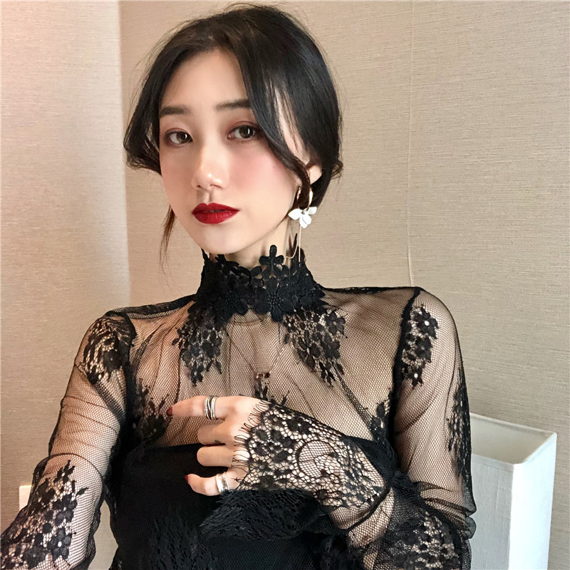 復古韓國chic風性感透視蕾絲鏤空高領顯瘦透視網紗喇叭袖內搭上衣