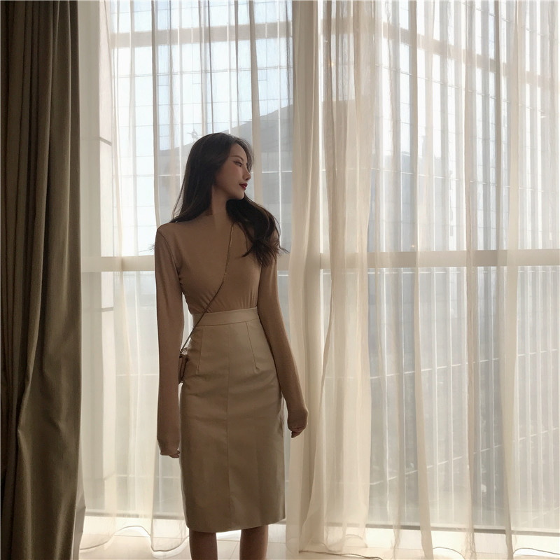 新款復古簡約基礎立領T恤高腰顯瘦中長款半身皮裙時尚套裝兩件套