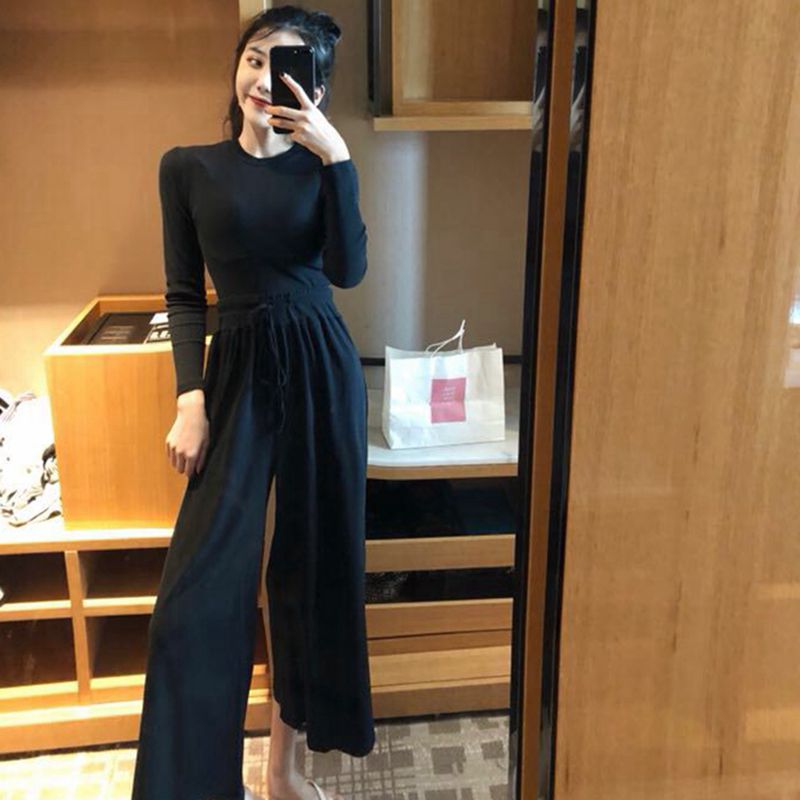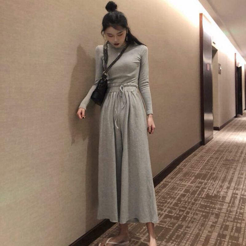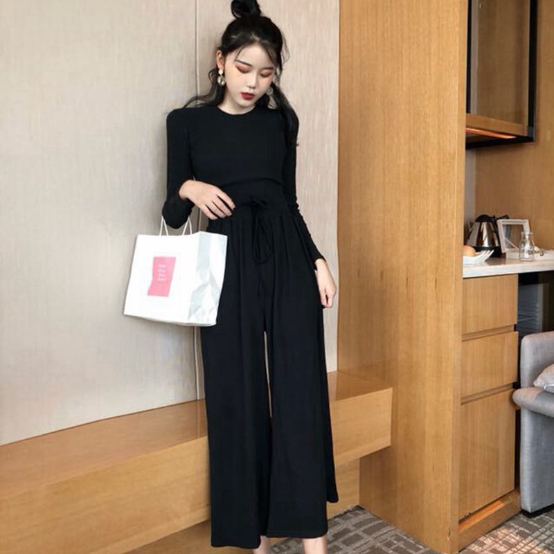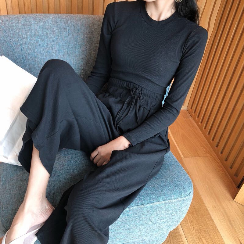 2018新款韓版時尚套裝純色圓領T恤休閑闊腿褲chic小清新兩件套女