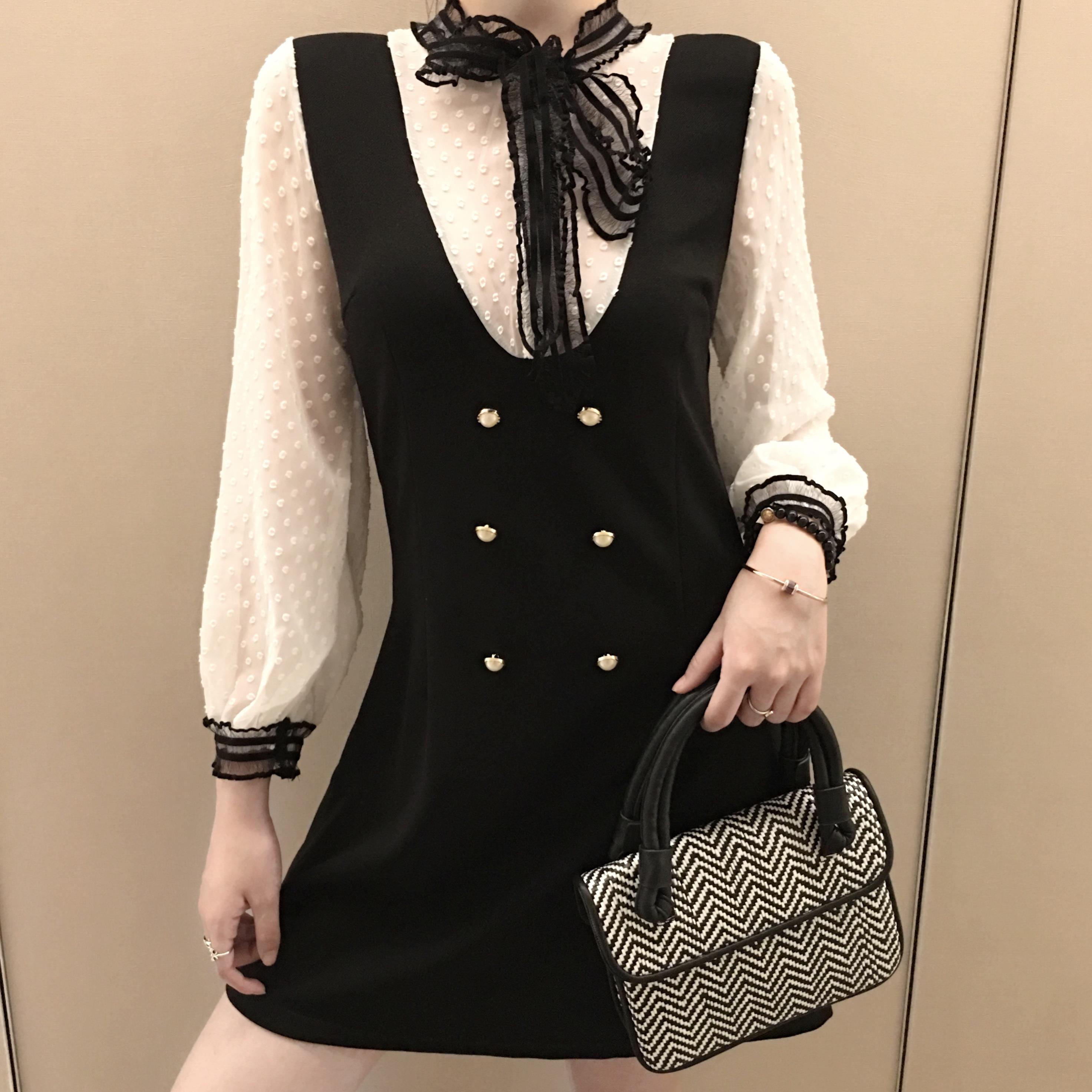 / 甜美時尚秋季網紅同款木耳邊蝴蝶結波點雪紡襯衫百搭背帶連衣裙女
