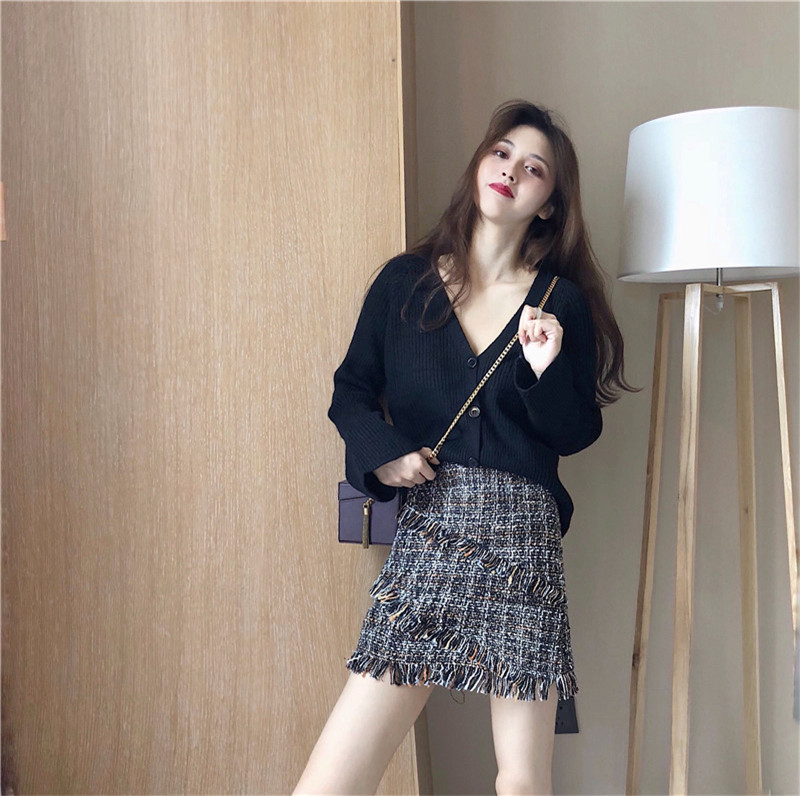 / 秋裝新款韓版時尚套裝V領喇叭袖毛衣針織開衫粗呢高腰a字半身裙女