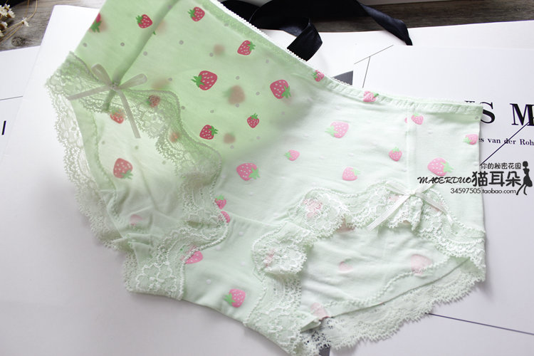 商品描述: 非常可愛的草莓印花 褲邊選用出精致的同色系蕾絲鑲邊,給肌膚舒適度 甜美淡雅,減齡清新,推薦! 低腰三角包臀基本款