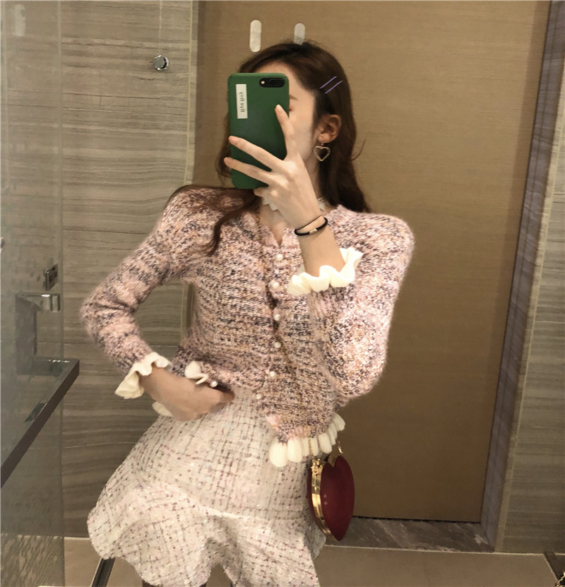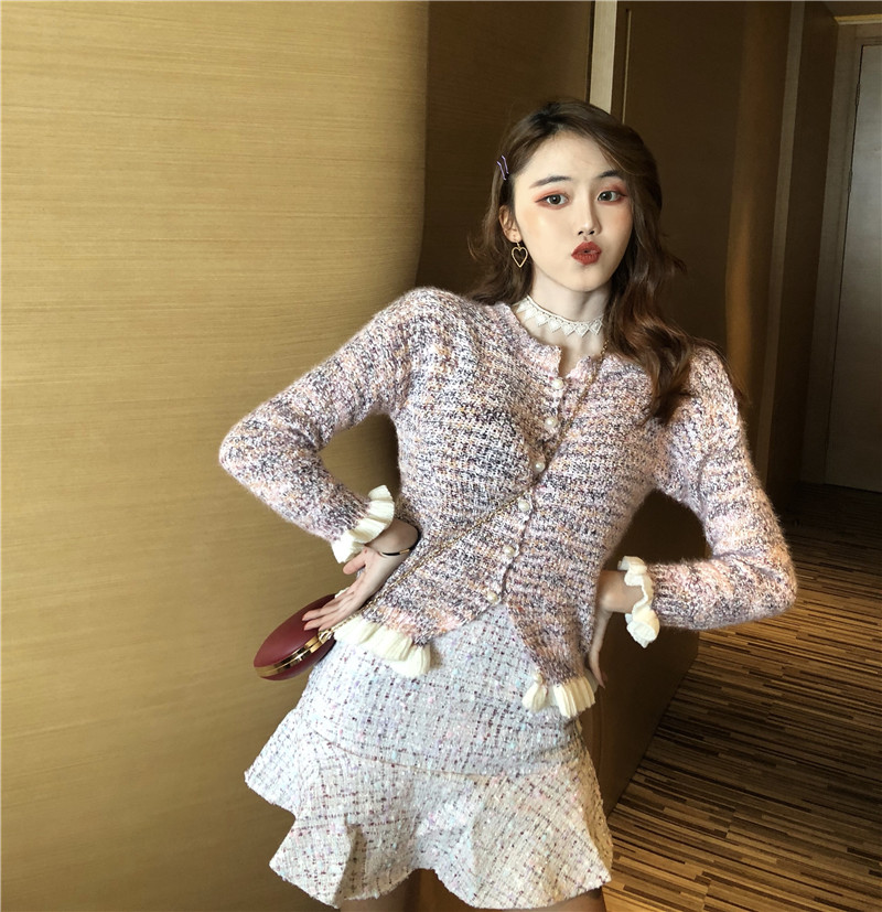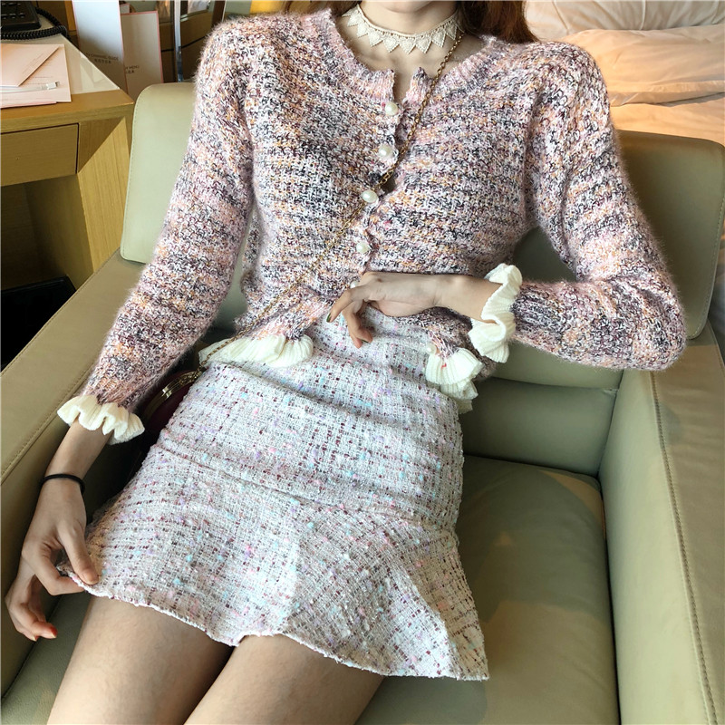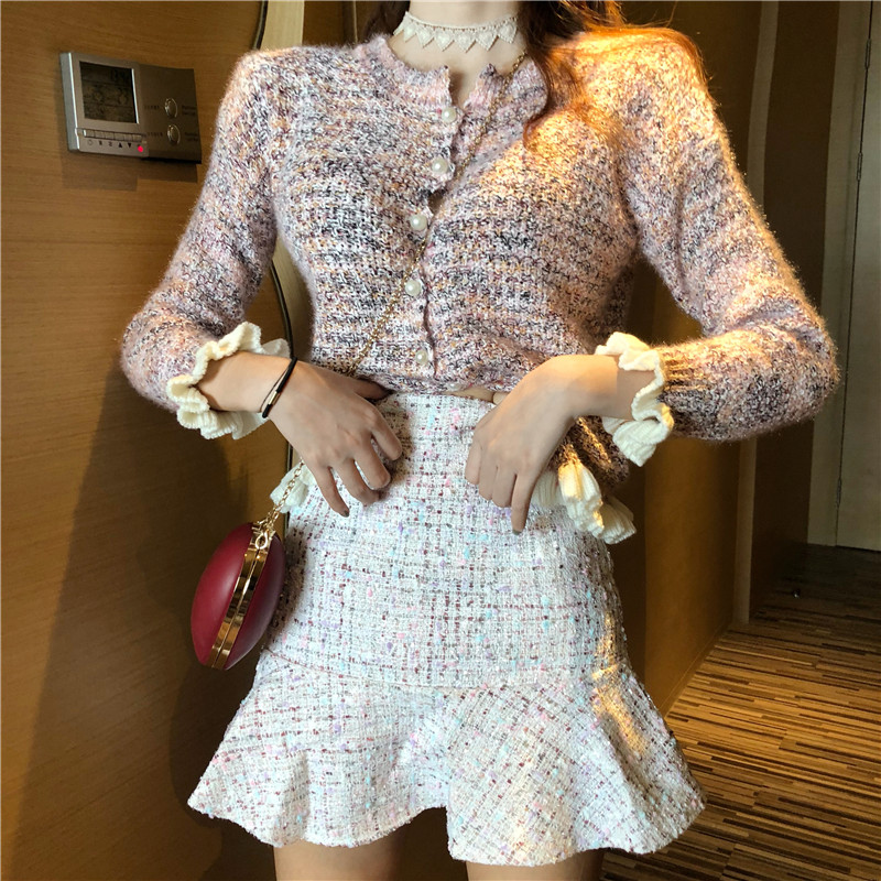 / 套裝女秋裝新款韓版復古波浪邊香風開衫小香風魚尾短呢裙兩件套潮