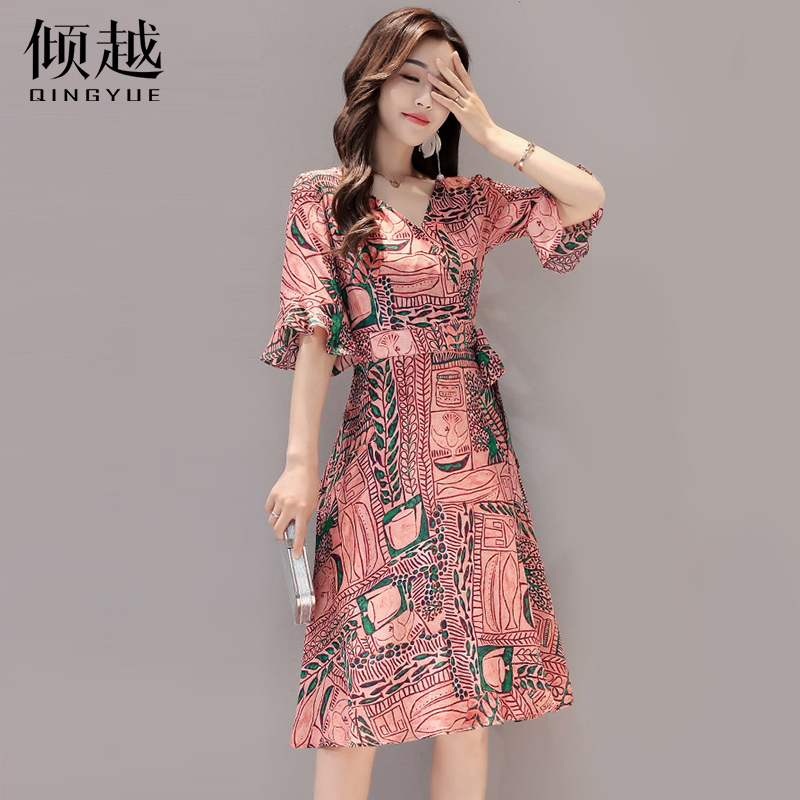 雪紡連衣裙女中長款2017夏季新款時尚氣質韓版修身顯瘦喇叭袖裙子