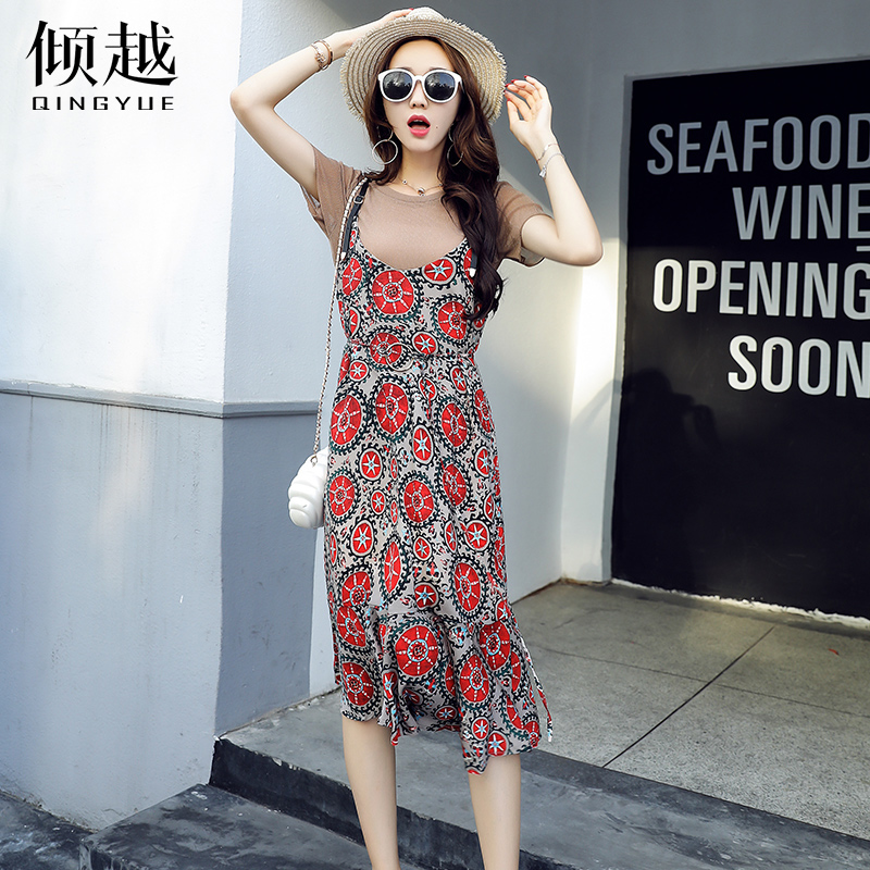 / 夏季連衣裙女裝2017新款夏裝修身短袖吊帶裙夏天兩件套印花中裙子